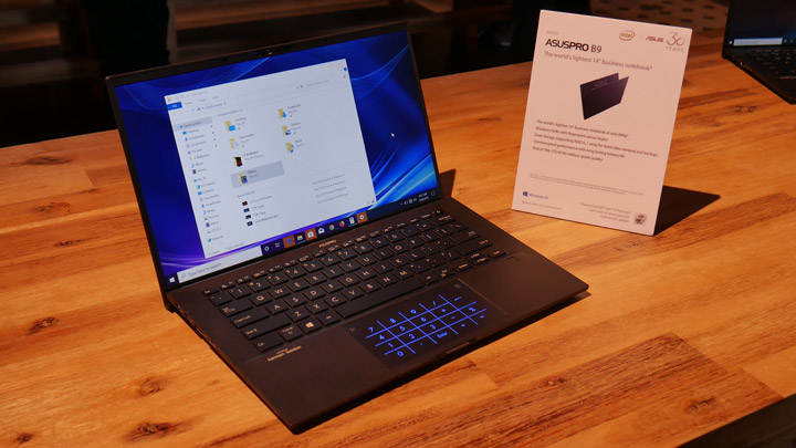 Далее презентация плавно перетекла в сферу бизнес-устройств. Свое виденье проекта «Афина» от Intel, компания реализовала в виде самого легкого в мире 14″ ноутбука ASUS PRO B9 (B9450). Его вес заявлен на отметке 880 грамм (для варианта с батареей на 33 Вт·ч) при толщине корпуса 14,9 мм. Экран занимает 94% верхней панели, с тонкими рамками со всех сторон. Параметры соответствуют классовым требованиям — процессор Intel Core i7 10-го поколения, два накопителя PCIe SSD на 1 ТБ, объединенные в RAID 0 или RAID 1, Thunderbolt 3, беспроводной модуль Wi-Fi 6 (802.11ax), биометрический логин с помощью ИК-камеры, чип безопасности TPM 2.0 и Windows 10 в комплекте. И ноутбук не просто легкий, он сертифицирован по военному стандарту США MIL-STD 810G. Предполагается устойчивость к падениям, ударам, вибрации, высоким и низким температурам, устойчивость к пролитой жидкости, сопротивление к скручиванию и способность работать при низком атмосферном давлении на большой высоте. Справедливости ради стоит отметить, что будет еще и вариант устройства с батареей на 66 Вт·ч и весом в 990 грамм.