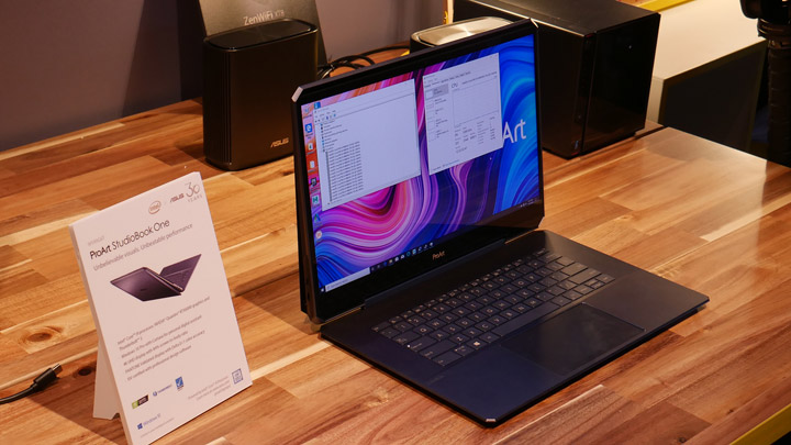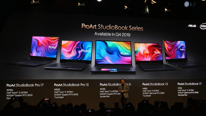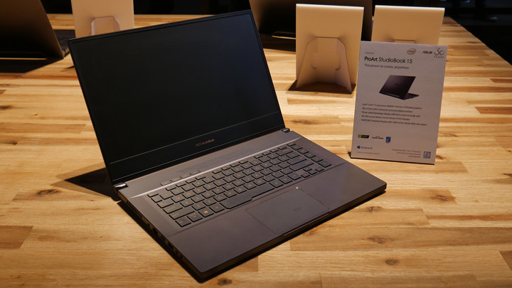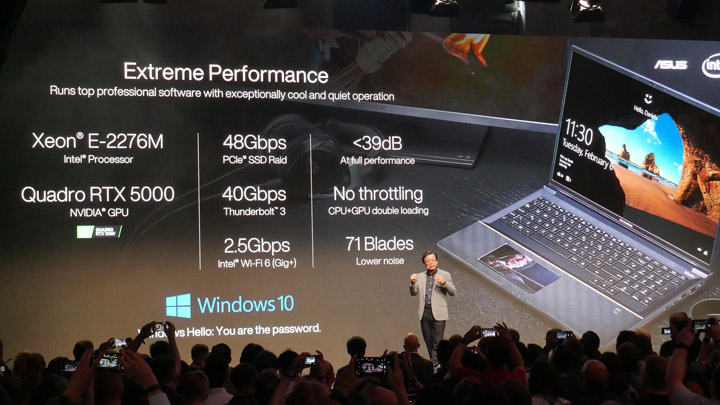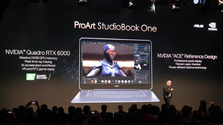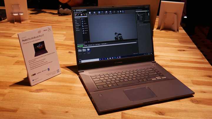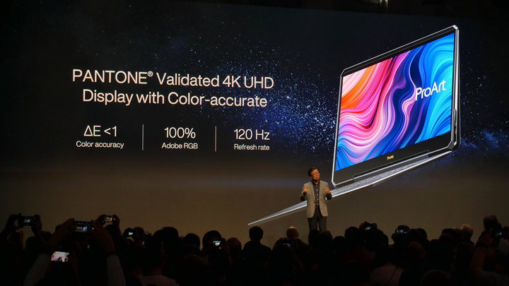Изюминкой и завершающим аккордом презентации стал ультимативный ноутбук ASUS ProArt StudioBook One. ASUS называет его самой мощной портативной рабочей станцией в мире. И это действительно очень компактное устройство, как для свое начинки. Ведь внутри у него Intel Core i9 и Nvidia Quadro RTX 6000 с 24 ГБ видеопамяти. Все основные компоненты расположены за экраном, а не под клавиатурой, как обычно. В развернутом состоянии задняя крышка открывается автоматически чтобы улучшить охлаждение. Естественно, дисплей здесь тоже под стать всему остальному — 4K UHD со 100% охватом цветового пространство Adobe RGB, Delta-E<1 и частотой обновления в 120 Гц. На нем вполне можно обрабатывать 8К-видео в режиме реального времени. Однако о мощности батареи и ее автономности предпочли скромно умолчать.
