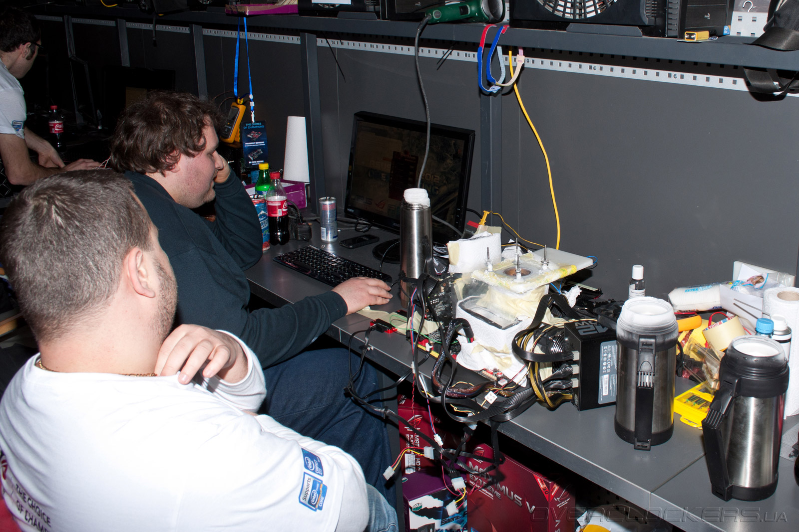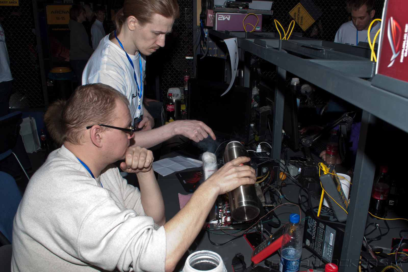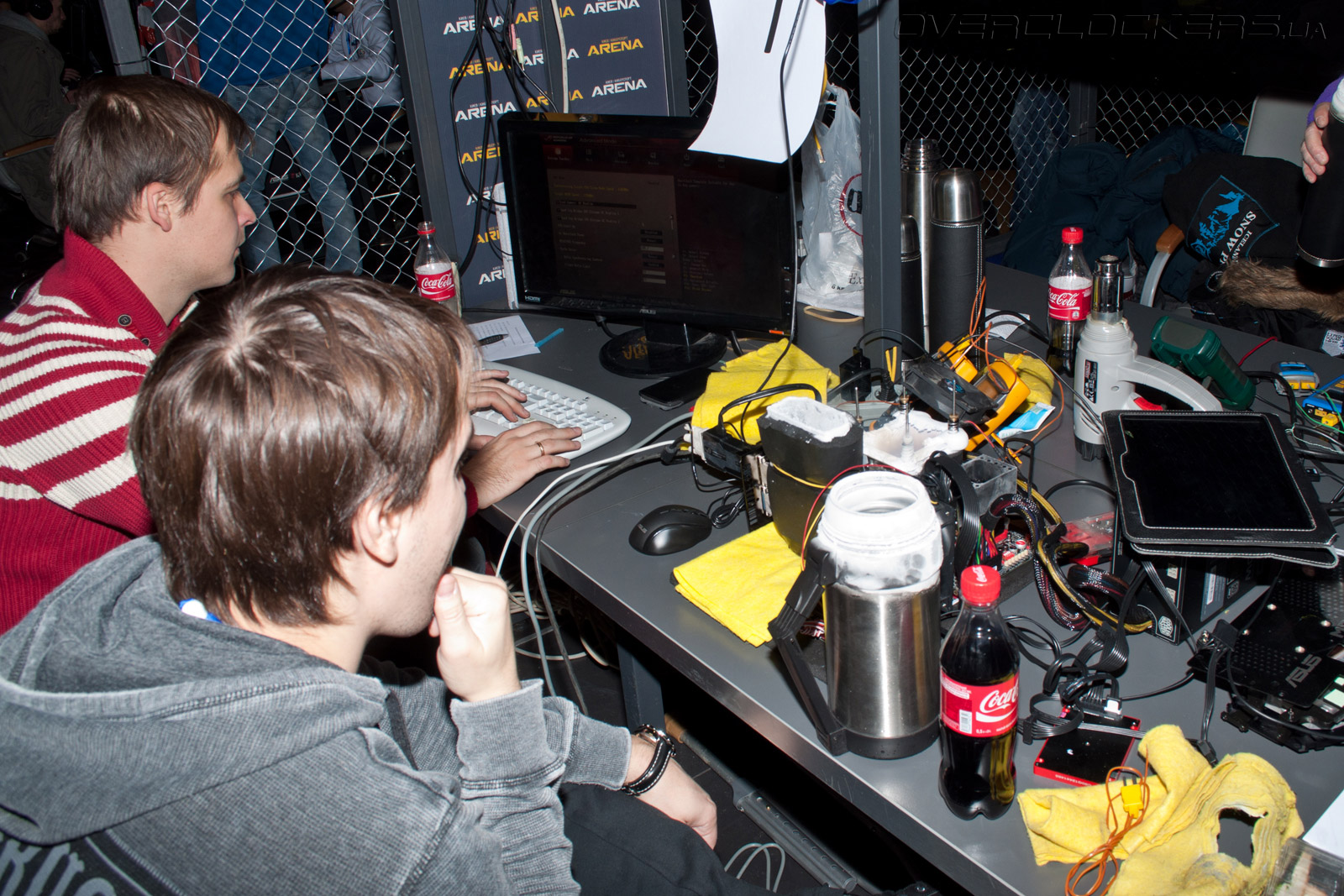 Вместе со слабыми очками в SuperPI 32M парни заняли восьмое место в общем зачете и получили стандартный набор подарков от ASUS: видеокарту и материнcкую плату. Впрочем, невысокие результаты в последней тестовой дисциплине 3DMark 11 можно объяснить не столько невезением, или малым запасом прочности комплектующих, сколько нехваткой жидкого азота. Задолго до окончания двух часов, отведенных на последний этап соревнования, оверклокеры истратили весь имеющийся запас и организаторам пришлось сливать остатки сжиженного газа для того, чтобы команды смогли закончить бенчмарки.