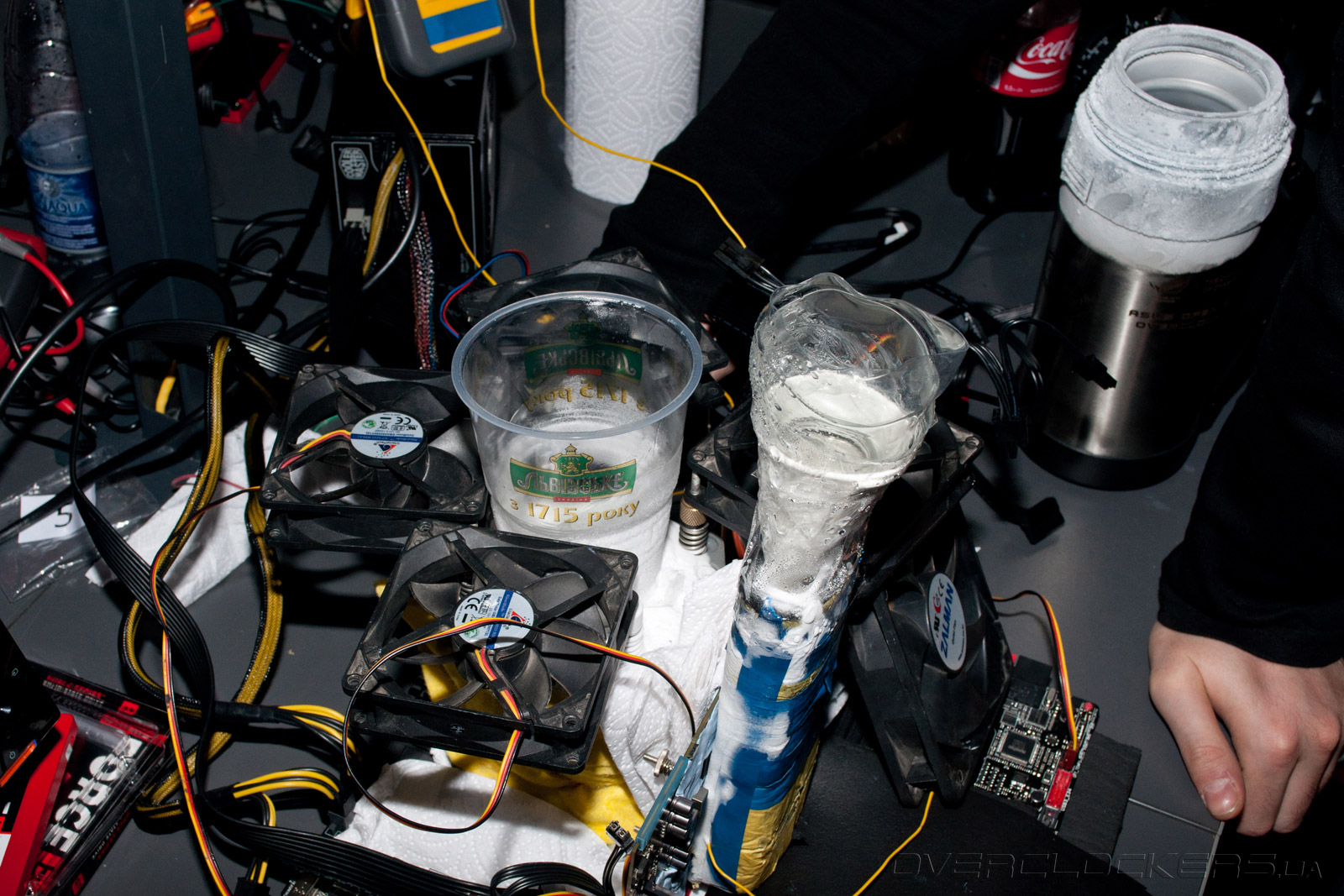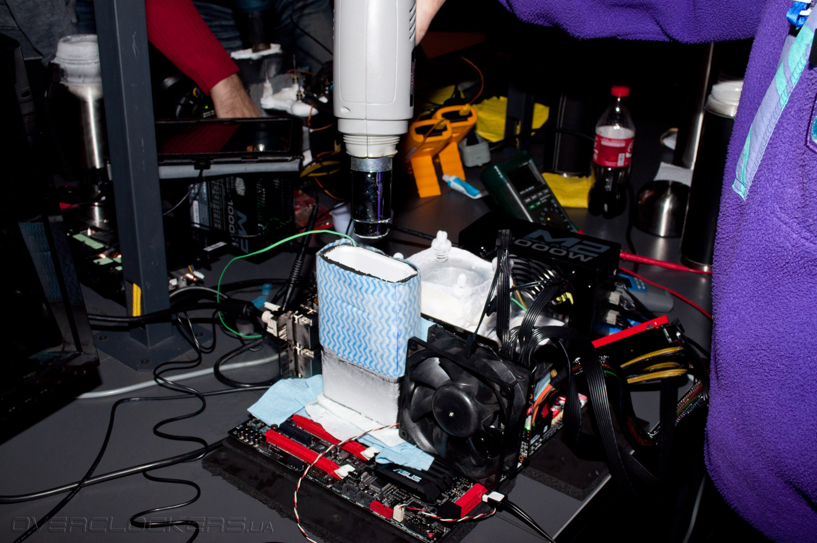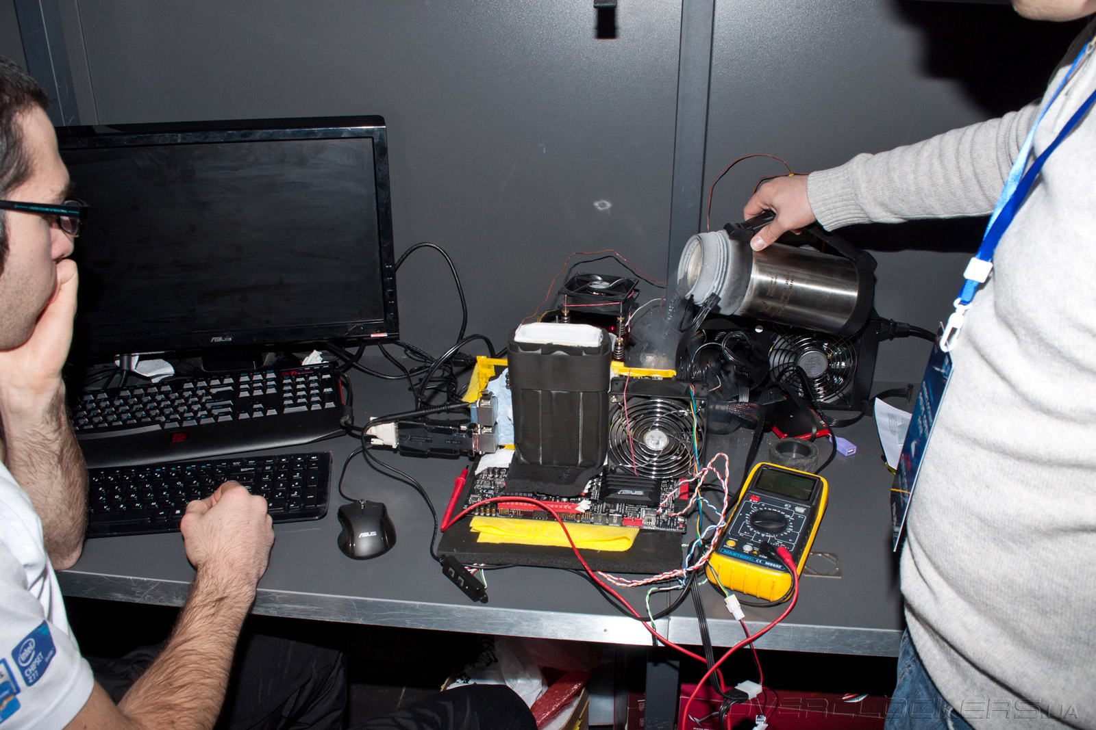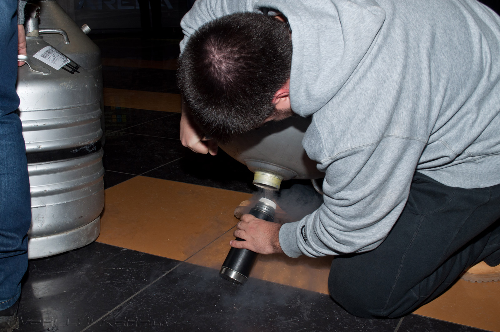 Вместе со слабыми очками в SuperPI 32M парни заняли восьмое место в общем зачете и получили стандартный набор подарков от ASUS: видеокарту и материнcкую плату. Впрочем, невысокие результаты в последней тестовой дисциплине 3DMark 11 можно объяснить не столько невезением, или малым запасом прочности комплектующих, сколько нехваткой жидкого азота. Задолго до окончания двух часов, отведенных на последний этап соревнования, оверклокеры истратили весь имеющийся запас и организаторам пришлось сливать остатки сжиженного газа для того, чтобы команды смогли закончить бенчмарки.