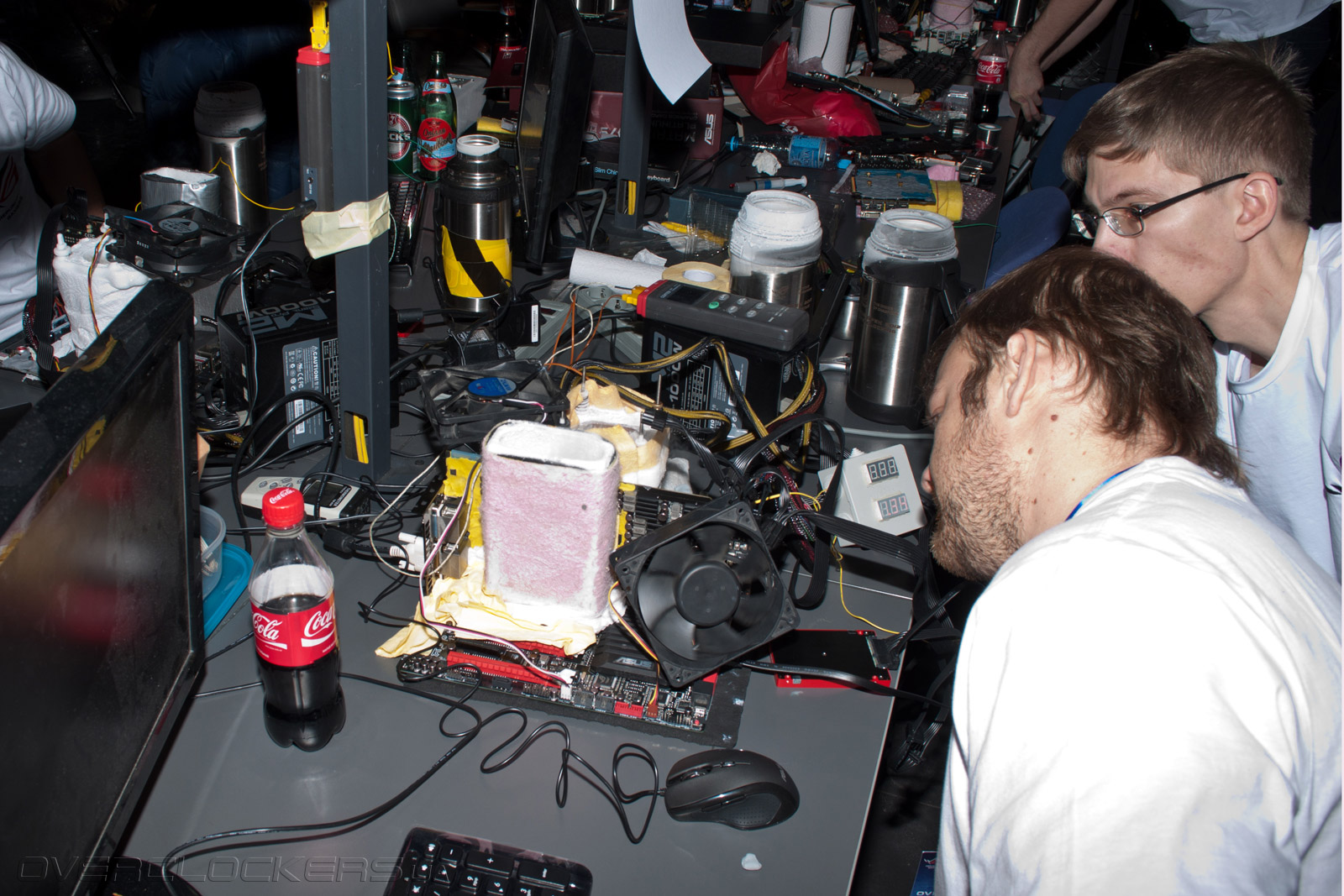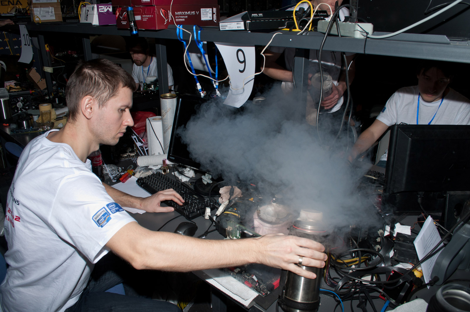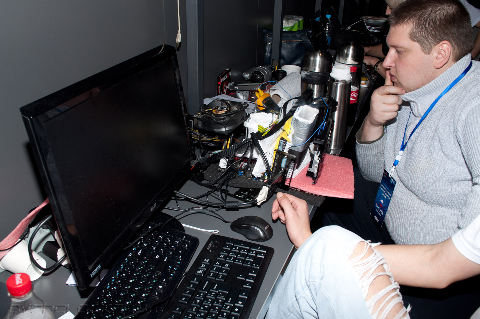 С самого утра субботы в клубе «КиберСпорт Арена» появилось огромнее количество сосудов Дьюара с жидким азотом, а тем временем участники соревнования начали подготовку тестовых стендов. Первое испытание заключалось в получении наименьшего времени расчета числа Пи с точностью до 32 миллионов знаков после запятой, в программе SuperPi, причем, тактовая частота процессоров в этой дисциплине строго лимитировалась на отметке в 5 ГГц, так что участникам соревнования пришлось проявить все свои навыки по оптимизации быстродействия системы. На постановку рекордов давалось всего два часа, тем не менее, конкурсанты умело распорядились своим временим и заработали первые очки. За соблюдением регламента внимательно следила команда во главе с главным судьей турнира TaPaKaH. В активе этого мастера разгона множество мировых рекордов по разгону процессоров, значимые достижения при форсировании видеокарт и богатейший опыт по настройке подсистемы оперативной памяти ПК.