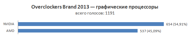 Как и прежде, здесь два основных игрока — Intel и AMD, вряд ли стоило бы ожидать чего-то другого. Обе компании представили ряд новинок — для Intel, в первую очередь, ими оказались процессоры архитектуры Haswell, а AMD выпустила новое поколения своих APU. По результатам нашего опроса прошлогоднюю «процессорную» битву AMD с треском проиграла, а ситуация в этом году, к сожалению для поклонников бело-зеленых, практически не изменилась. Даже несмотря на ряд успешных, казалось бы, достижений AMD, вроде единоличного «захвата» рынка игровых консолей со своими APU (хотя, нужно признать, здесь немаловажную роль сыграла графическая составляющая этих чипов), Intel по мнению наших читателей продолжает являться стабильным лидером процессорного рынка. Однако, все же стоит сказать, что это заслуга не только Intel, но и самой AMD в том числе, которая, по сути, не показала ничего нового. И это при том, что процессоры архитектуры Haswell также не стали прорывом в плане производительности, да и всем знакомая история с не лучшим термоинтерфейсом между кристаллом и крышкой ЦП тоже не восхищает. Что же, будем ждать нового витка в виде грядущих Steamroller и Broadwell.