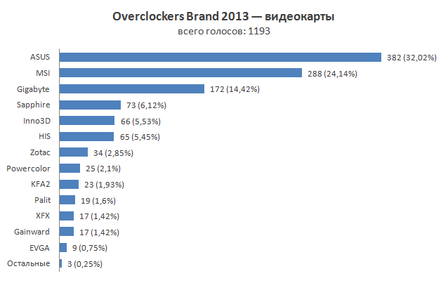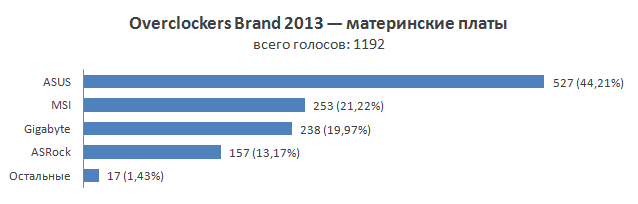 Конечно же, главным событием 2013 года в этом сегменте рынка оказался выпуск процессоров Haswell и, соответственно, новых чипсетов 8-й серии. Intel еще сильнее ограничила возможности разгона, поэтому производители материнских плат все больше и больше уделяют внимание реализации разнообразных дополнительных функций. На рынке «материнок» все так же четыре основных игрока — ASUS, MSI, Gigabyte и ASRock. Результаты опроса практически полностью идентичны прошлогодним. Бессменным лидером остается компания ASUS, со значительным отрывом опережая свои преследователей в лице MSI и Gigabyte, которые идут почти вровень. Замыкает четверку ASRock. Остальные участники опроса не набрали и десятка голосов. В следующем году уже весной мы ждем очередного обновления чипсетов и соответствующих материнских плат — посмотрим, произойдут ли впоследствии какие-нибудь глобальные изменения.