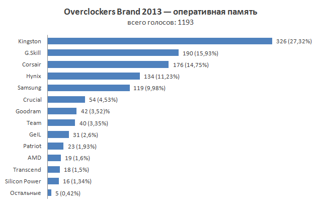 Интересные перестановки произошли среди производителей оперативной памяти. Золотую награду все так же уверенно получает Kingston со своей продуктовой линейкой HyperX. А вот Samsung со второго места опустилась на пятое, уступив место компаниям, делившим прошлогоднее третье место. Серебро достается G.Skill, позиционирующей свою продукцию, в первую очередь, как память для энтузиастов, которая замечена не один раз в этом году в составе систем, покоривших новые рекорды. Почетное третье место занимает Corsair. В числе ее продуктов тоже имеются неплохие модули ОЗУ, ориентированные на оверклокеров и энтузиастов.