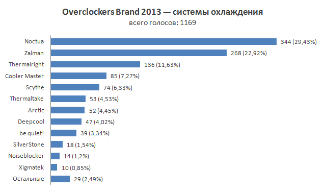 Вот где-где, а в этой категории все более чем стабильно и без изменений. Лидерство за австрийской Noctua, которая уже очередной год со своим суперкулером NH-D14 даже и не думает смещаться с первой строчки нашего голосования. На второй позиции — Zalman. Ее продукты хоть и уступают по производительности лидеру, однако ценовая политика компании куда более приемлема. Хотя, стоит обратить внимание на то, что разрыв между этими двумя производителями все же увеличился. Замыкает тройку лидеров Thermalright, которая как и Noctua делает акцент на высокопроизводительных и дорогостоящих решениях.