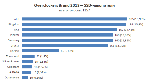Еще в 2012 году все говорили о финансовых проблемах у победителя прошлогоднего голосования — компании OCZ. Необратимое все же произошло — буквально накануне нашего опроса было объявлено о банкротстве фирмы и возможности ее ухода в собственность Toshiba. Тем не менее, уже по сути несуществующая компания оказалась в итоге на третьей строчке нашего рейтинга. Лидерами же в этот раз стали Intel и Kingston с разрывом в один голос в буквальном смысле. Отдельно стоит выделить бренд Plextor, о котором в прошлом году вообще мало кто упоминал в контексте SSD, и который теперь у всех на устах, благодаря тому самому «удачному продукту».
