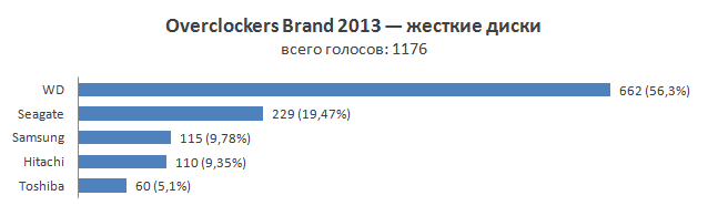 А вот в сегменте HDD-накопителей, напротив, тишь да гладь. Мы и в этом году предложили в опросе пять марок накопителей, хотя, по сути, ряд из них принадлежит одним и тем же компаниям. Речь, конечно же, о WD, к которой относят Hitachi, и Seagate, владеющая производством Samsung. Тем не менее, присутствие на нашем рынке накопителей всех указанных марок и побудило нас на упоминание их в вариантах опроса. Western Digital как и в прошлогоднем голосовании стабильно занимает первую позицию, а «серебряная» награда достается Seagate. Toshiba в сравнении с прошлым годом значительно подтянула свои позиции, однако до лидеров еще очень и очень далеко.