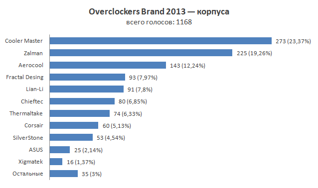 Первую строчку заслуженно занимает Cooler Master. Следом мы видим Zalman, предлагающую, как и в случае с СО, более приемлемую ценовую политику. И уже традиционно для нашего опроса третье место достается Aerocool.