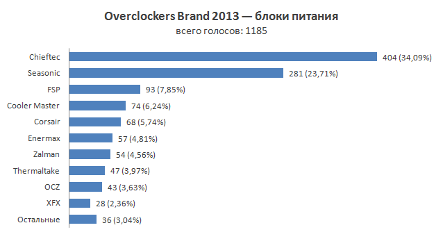 Отрыв Chieftec, получившей и в этом году «золотую» награду, от ближайшего преследователя довольно заметно увеличился. Это может свидетельствовать о смещении потребительского спроса к устройствам подешевле с более приемлемым соотношением цена/производительность. В IV квартале на рынок поступила новая серия источников питания Chieftec Navitas, обладающих сертификатом 80 Plus Gold, которые вышли достаточно качественным продуктом, хоть и с небольшими претензиями. Если в прошлом году первая позиция Chieftec казалась чем-то удивительным, то в этом такая ситуация уже кажется привычной.