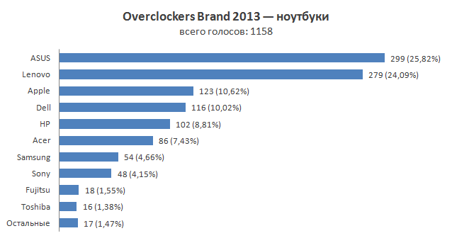 Наступление на рынок ноутбуков продолжает Lenovo. Крайне агрессивная ценовая политика и множество маркетинговых активностей этого производителя позволяют ему занимать значительную долю рынка и соперничать с ASUS. Сама же ASUS в последнее время все больше и больше внимания уделяет мобильным устройствам и гаджетам. Видно, что акцент компании еще больше сместился в эту область и она старается следовать своему лозунгу «In search of incredible», пробуя все новые и новые форм-факторы мобильных устройств. Хотя не остаются без внимания и привычные ноутбуки, достаточно вспомнить о представленном к этом году новом ультрабуке Zenbook. По итогам голосования ASUS находится на первой позиции, опережая Lenovo всего лишь на пару десятков голосов.
