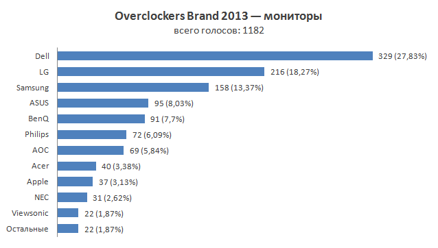Если довериться мнению аудитории нашего портала, то на вопрос о выборе монитора многие несомненно посоветуют продукцию Dell. Компания производит достаточно недорогие мониторы, обладающие в то же время хорошей матрицей — что еще нужно для пользователя? На оставшихся двух призовых местах так же, как и в прошлом году расположились LG и Samsung, с той лишь разницей, что второй теперь оказалась LG, а Samsung досталась третья строчка.