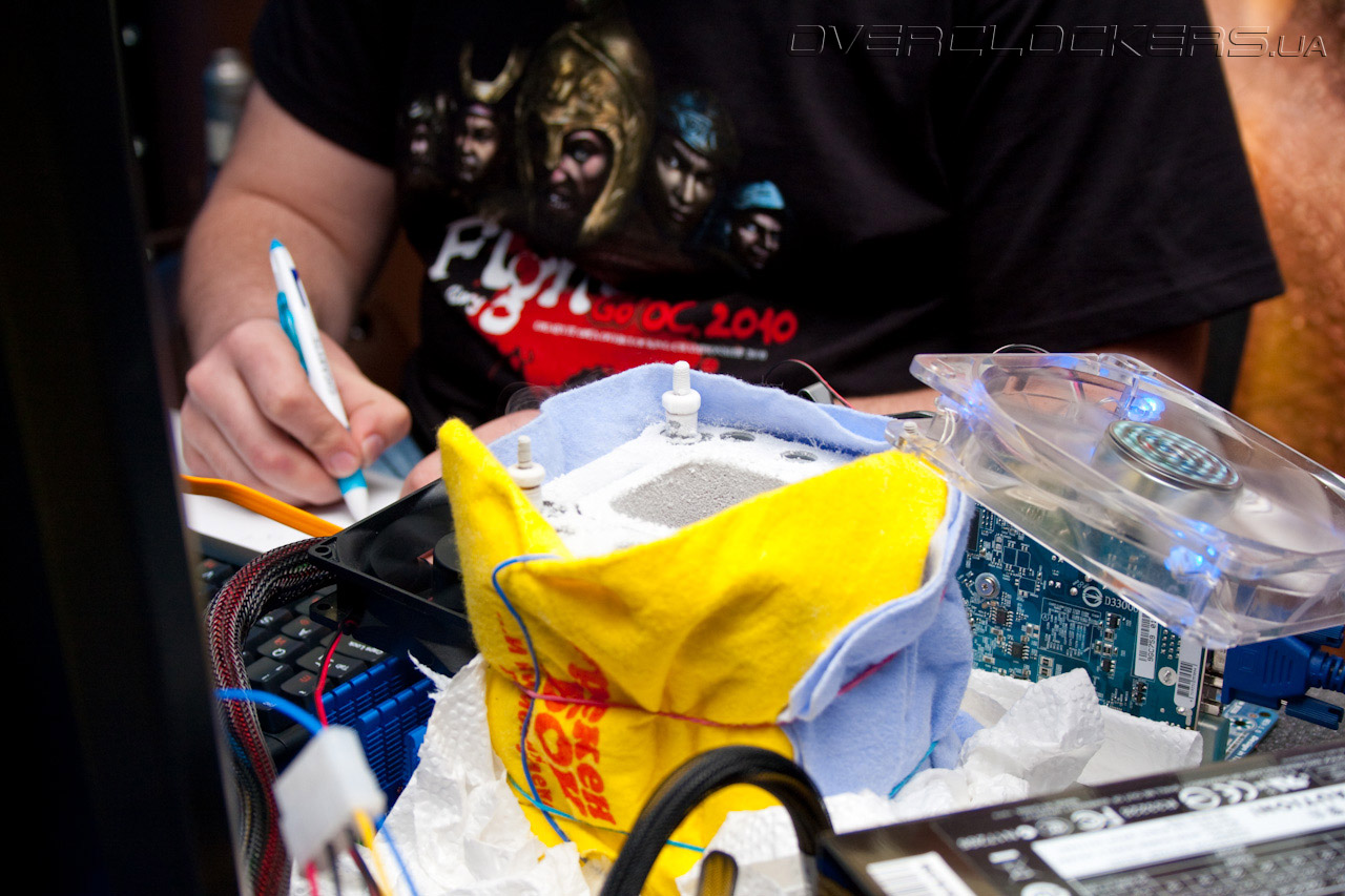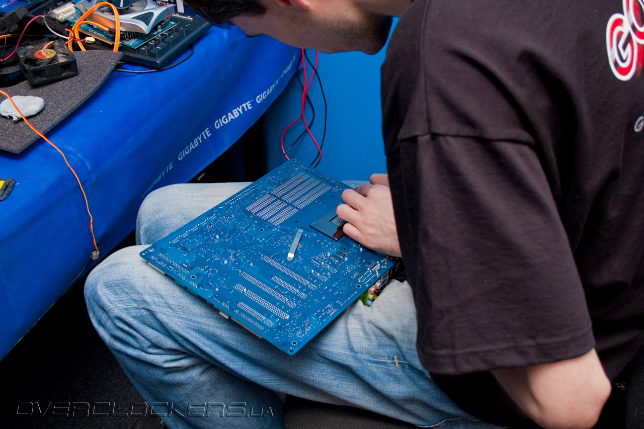 TiN демонтирует стоковую систему охлаждения материнской платы для теплоизоляции сокета. Судя по последним двум снимкам, некоторые участники турнира привыкли выполнять подобные операции на коленках. Зачем им столы? Очень даже удобно и без них...