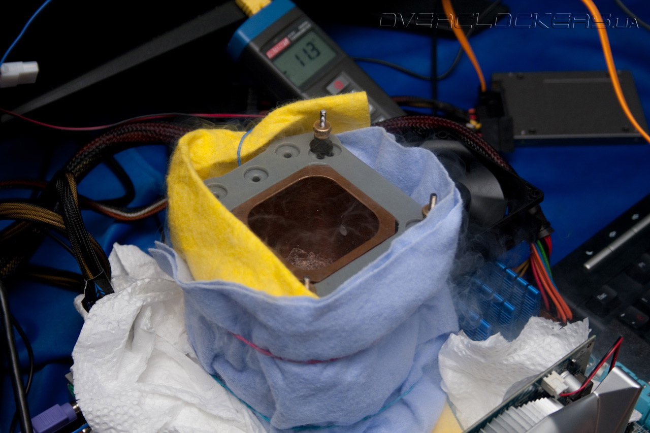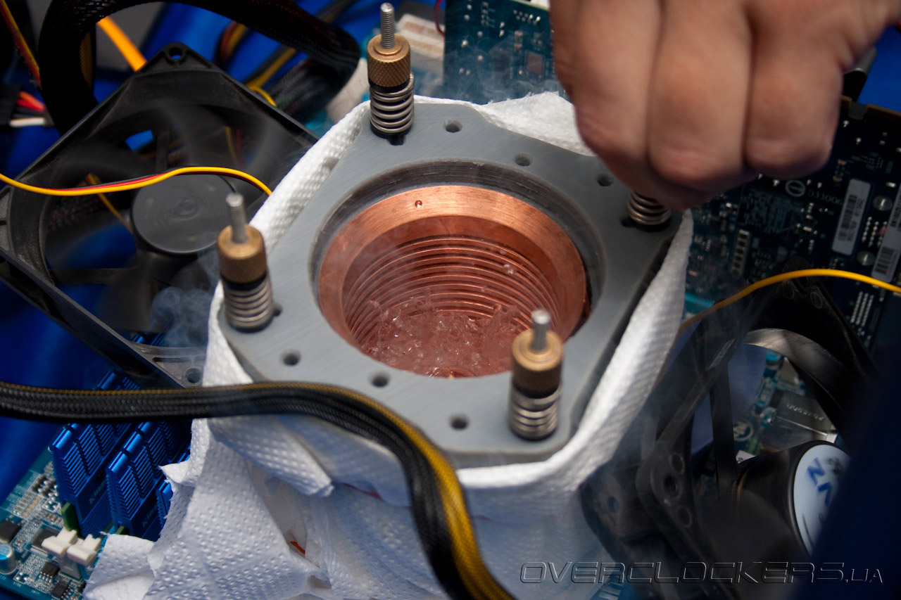 Последний фотоснимок весьма интересен. Опытный оверклокер наверняка уже заметил кое-что необычное. Дело в том, что на украинском стакане американская, т.е. неродная крепежная пластина. Сверху MAGNUM’а установлено модифицированное пластиковое крепление от всё того же Dragon F1, с высверленным кругом по центру. Впрочем, это не главное — конструкция надежно закреплена и можно спокойно бенчить.