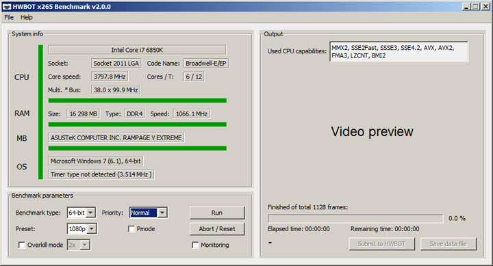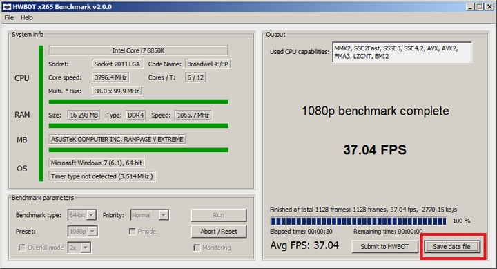 Для получения лучшего результата нет необходимости делать множество различных оптимизаций, достаточно в самом бенчмарке выбрать «Benchmark type — x64», и выставить Priority — Realtime. Как только он закончится — на экране, в окне программы, появится результат. Откройте необходимые окна CPU-Z и сделайте скриншот, нажав кнопку Save data file в окне HWBOT x265 Benchmark.
