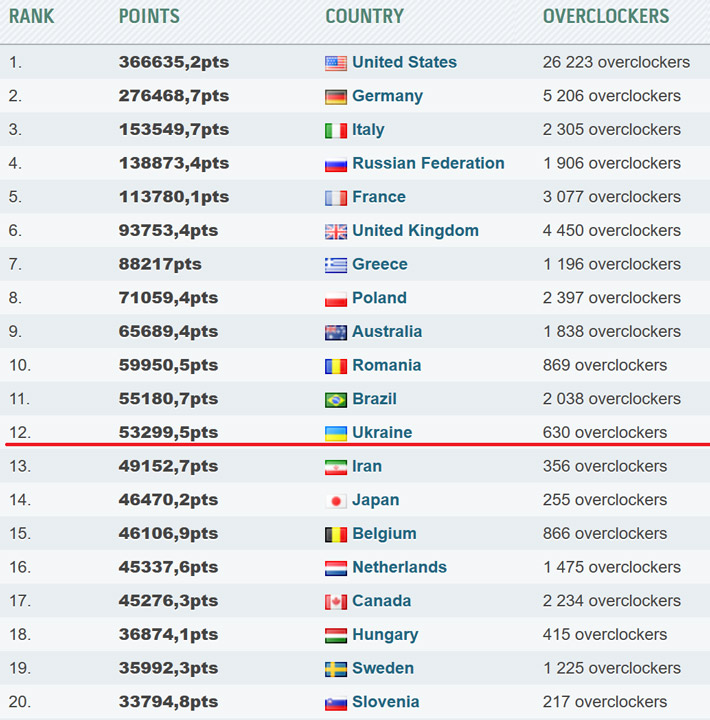 В прошлом году упорства оверклокеров хватило на 8-е место для Украины. Давайте же в этом году разгоним «железяки» как следует, и принесем стране ТОП-5!