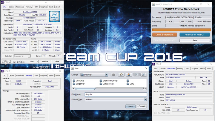 - Подготовить CPU-Z (открыть три окна с вкладками CPU, Memory, и если хватает места на экране — Motherboard), расположить окна таким образом, чтобы было видно надпись #HWTC16 на обоях Рабочего стола. Пример ниже: