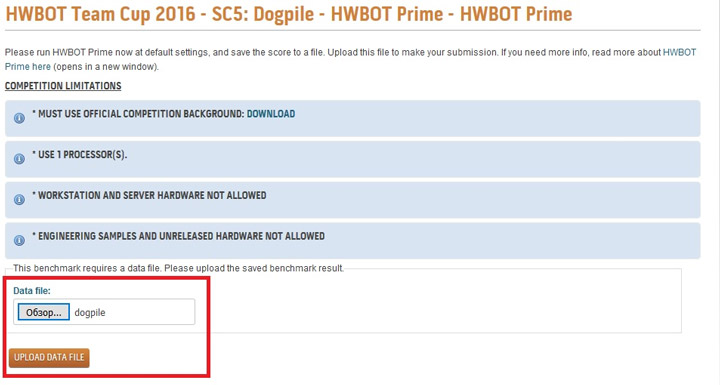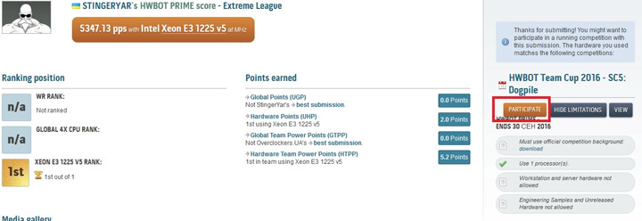 - Зайти на сайт HWBot.org и в своем личном профиле (Кнопка My profile) подать лучший результат на соревнование (переходите на страницу этого результата и в правом углу ищите HWBOT Team Cup 2016 – SC5:Dogpile, после чего нажимаете кнопку Participate).