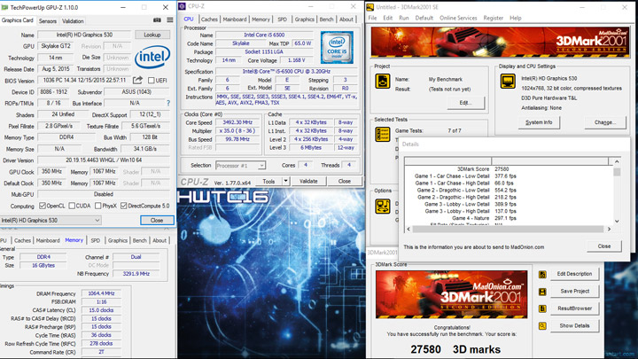 - Подготовьте скриншот по образцу: два окна CPU-Z (Memory и CPU), GPU-Z, и результат с самим 3DMark Score (когда тест показал результат, нажимаете там кнопку Show Details и промотайте до строчки RESULTS), и, само собой, наличие #HWTC16 на обоях.