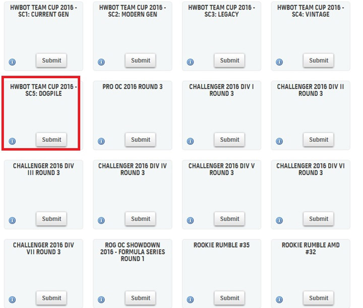 - Промотайте список дисциплин в самый низ, где расположены соревнования, нас интересует HWBOT Team CUP 2016 - SC5: Dogpile.