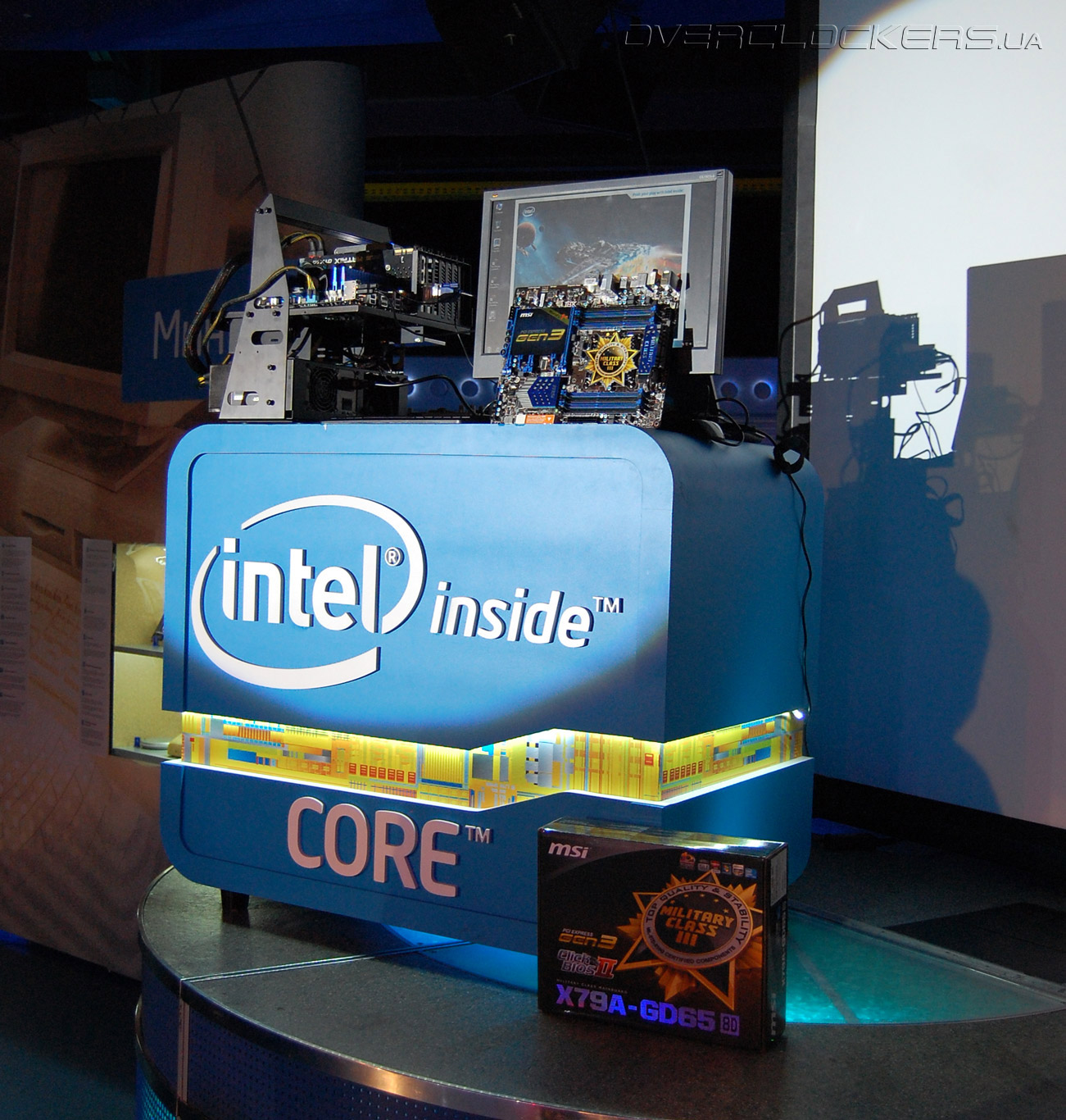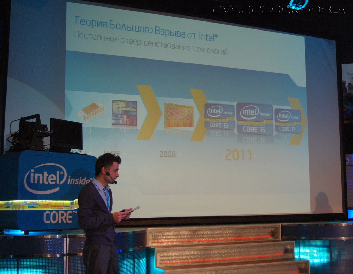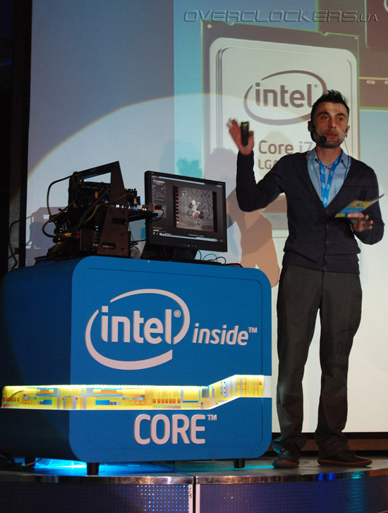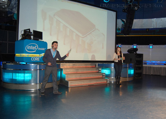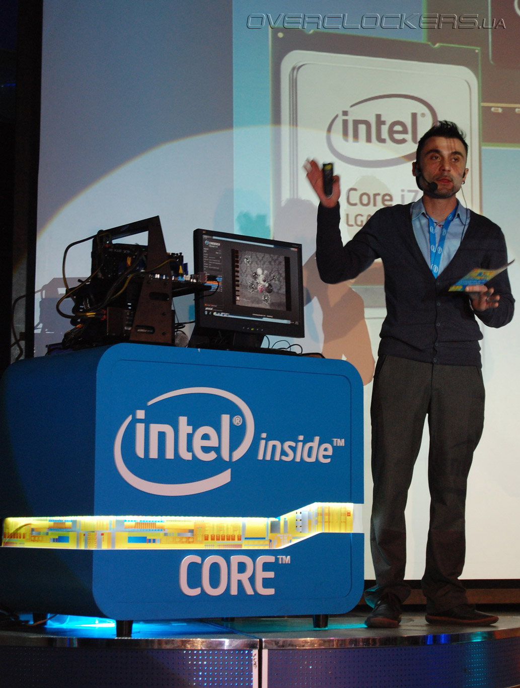 Совсем немного времени было уделено презентации свежих шестиядерных процессоров Sandy Bridge-E и платформы LGA2011. Один из двух ведущих вечера Юрий Миколишин ограничился показом слайдов из пресс-кита и пригласил всех желающих ознакомиться с готовым решением на стенде.
