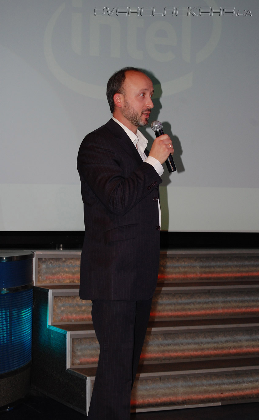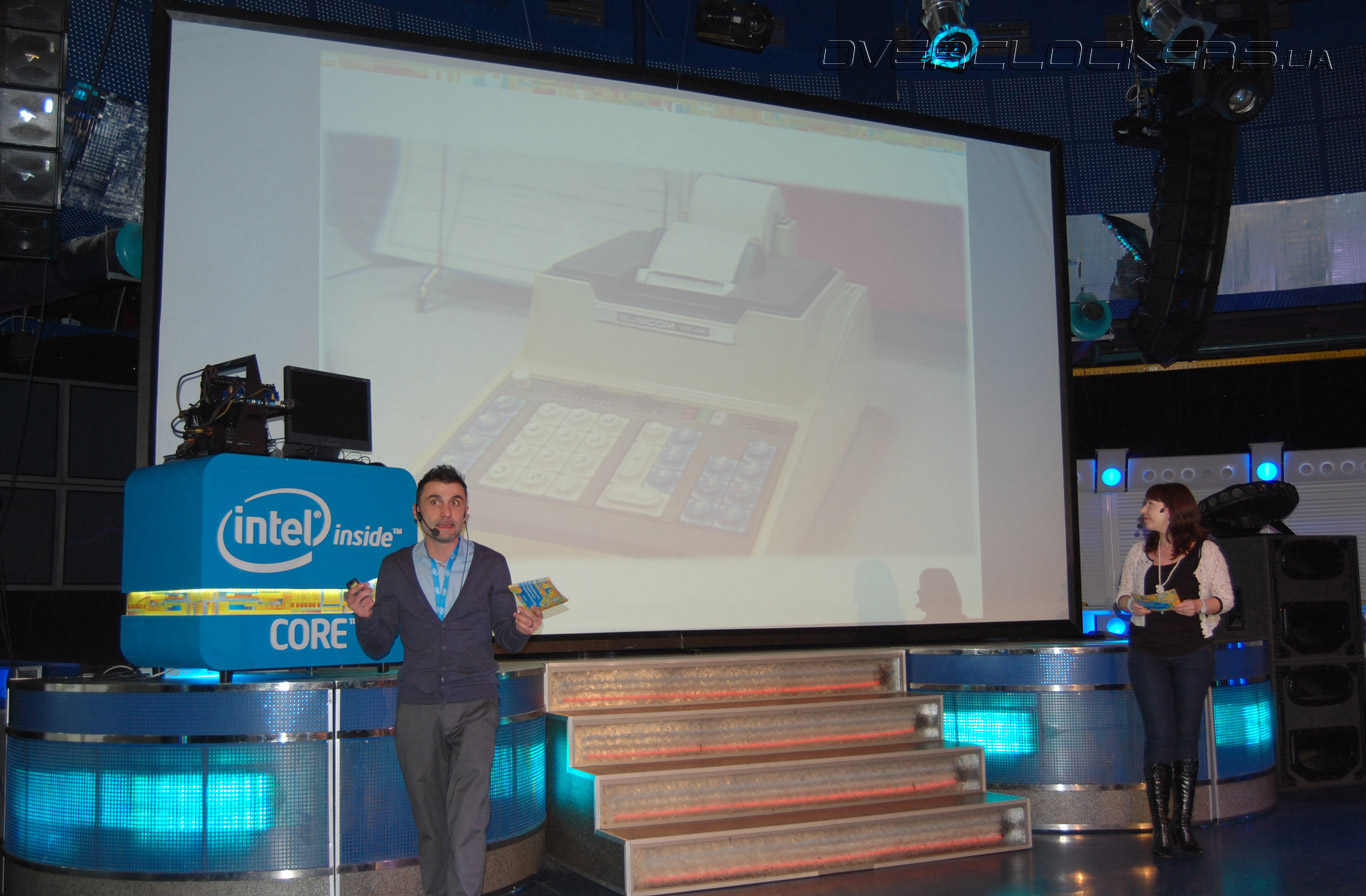 Вечер открыли наши старые знакомые — директор по маркетингу Intel в Украине Юрий Миколишин и руководитель PR-службы Мария Бородай. Те, кому посчастливилось хотя бы раз побывать на презентации процессоров Intel, наверняка легко их узнают. Мария и Юрий вкратце пересказали нам историю развития массовых микропроцессоров за все 40 лет их существования. Не обошлось без параллелей с современными CPU: топовые процессоры Intel Core сейчас в 350 тыс. раз быстрее i4004 с учетом всех технологических новшеств, а каждый транзистор потребляет в 5000 раз меньше электроэнергии, чем 10-микронный; если бы нынешние Intel Core выпускались на базе 10 мкм норм, то их площадь составила бы 7 на 3 метра. Представляете себе объявление в газете «Куплю гараж для компьютера»? :)