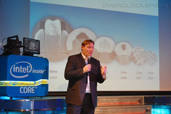 Руководитель представительства Intel в Украине Владимир Шаров на правах хозяина мероприятия выступил с более пространной речью, затрагивающей как философские, так и практические аспекты IT. В частности, было озвучено намерение Intel в 2017–18 гг. перейти на 8 нм техпроцесс производства процессоров, хотя еще недавно такое уменьшение размеров транзисторов многим ученым казалось неосуществимым.