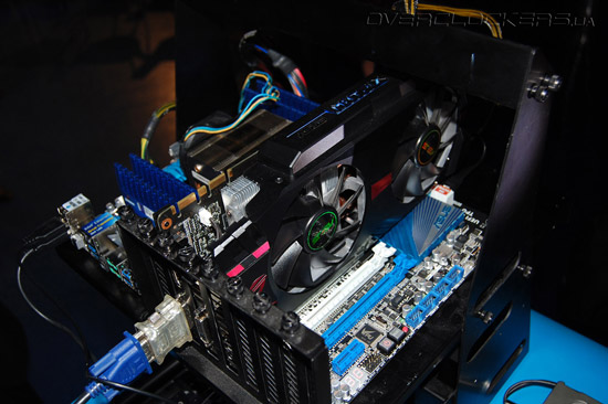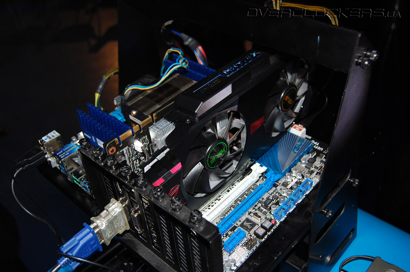 Стенд включал материнскую плату ASUS P9X79 Deluxe, видеокарту ASUS серии ROG Matrix на чипе GeForce, четырехканальный комплект оперативной памяти Kingston HyperX и OEM-кулер Intel.