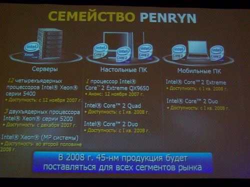 Помимо краткого экскурса в историю процессоростроения, Владимир поделился данными относительно столь ожидаемого семейства процессоров Penryn, которые, собственно говоря, и были анонсированы в этот день. Что же дает нам переход на новый технологический процесс и использование процессоров Penryn в целом? А преимуществ немало, это: