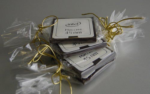 Ну и конечно, по окончанию чрезвычайно секретного 45-нанометрового мероприятия все агенты по внедрению в жизнь новинок в сфере высоких технологий от Intel имели возможность пообщаться и задать интересующие их вопросы в дружественной и непринужденной атмосфере. Судьба агентов, которые задавали наиболее каверзные вопросы, до сих пор неизвестна. Ходят слухи, что они живы, но находятся в подземных лабораториях корпорации Intel и принимают непосредственное участие в разработке 22-нм техпроцесса, после успешного внедрения в жизнь оного агенты получат свободу. Личности, которые вели себя лояльно и проявили должный интерес и внимание к новейшим разработкам и не уснули в процессе презентации, получили в качестве подарка вот такие шоколадные процессоры для апгрейда.