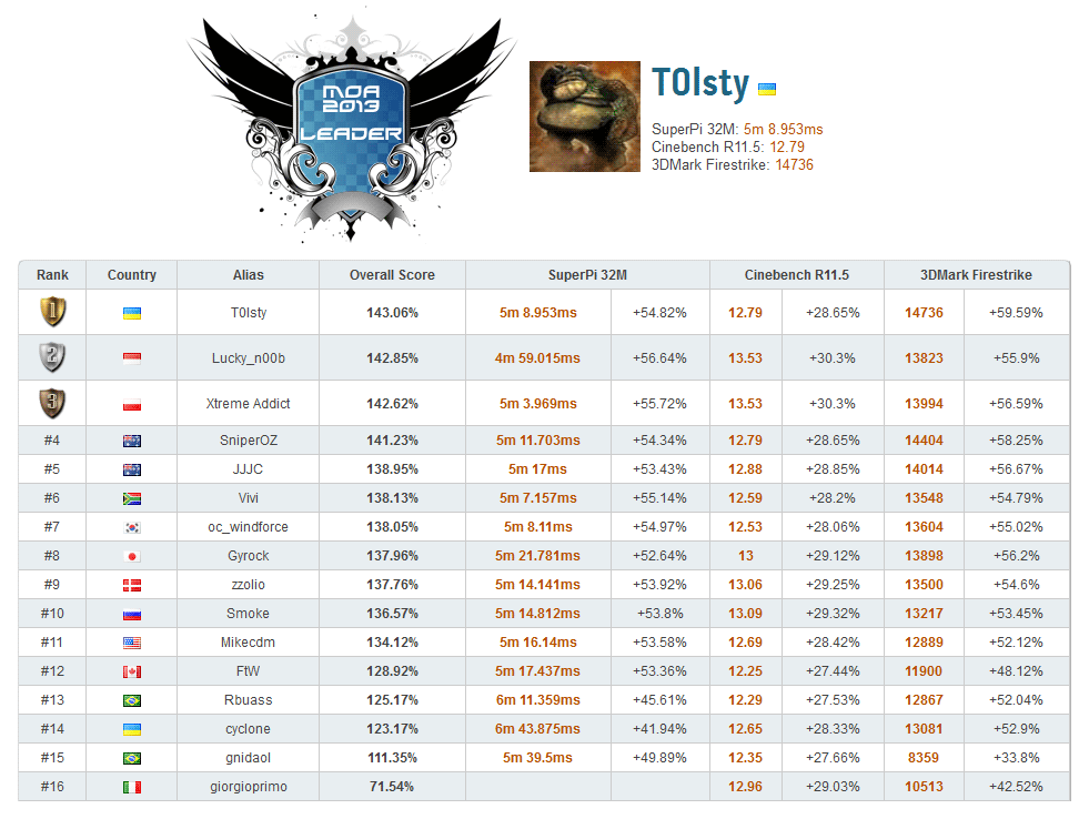 Невероятно, но меньше чем через две недели T0lsty завоевал первое место и по итогам «Большого финала» соревнования MSI Master Overclocking Arena 2013 (г. Тайбэй). От Cyclone удача отвернулась, но, надеюсь, ненадолго.