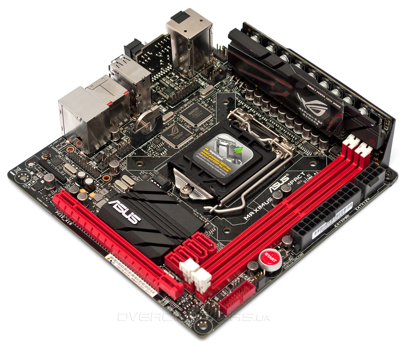 Нетривиальный внешний вид и по-настоящему «крутая» для решений Mini-ITX функциональность отличают еще один продукт линейки ASUS Republic of Gamers — Maximus VI Impact на чипсете Intel Z87. Анонсированная в июне материнская плата появилась в продаже только в конце августа. В сущности, изделие состоит из нескольких плат — основной PCB размером 170x170 мм, вертикальных модулей Impact Power (восемь фаз питания), mPCIe Combo II (сетевой адаптер 802.11ac и разъем M.2 для твердотельного накопителя), SupremeFX Impact (аудиокодек Realtek ALC1150, усилитель для наушников) и небольшой платы Impact Control в районе задней панели с кнопками ROG Connect, Clear CMOS, MemOK!, Direct Key и цифровым индикатором Q-Code. ASUS Maximus VI Impact в сентябре побывала в нашей лаборатории, чему посвящен отдельный материал.