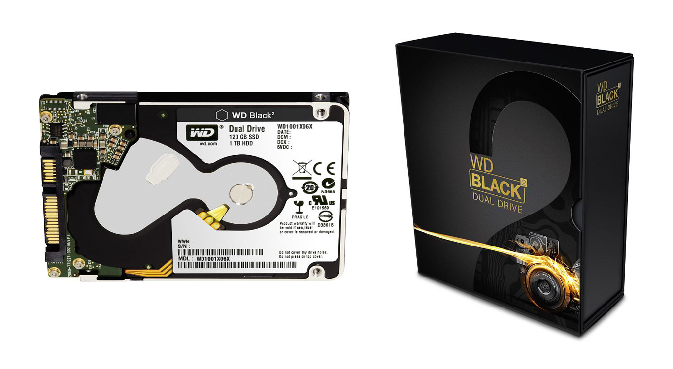 Что пока не имеет аналогов, так это комбинированный HDD/SSD-накопитель WD Black2 с маркировкой WD1001X06XDTL. Детали его конструкции — две алюминиевые пластины для записи 1 ТБ (2x 500 ГБ) информации и чипы 20-нм флеш-памяти типа NAND MLC, рассчитанные на 120 ГБ данных — делят между собой интерфейс Serial ATA 6 Гбит/с и запитаны от одного разъема SATA Power. Форм-фактор 2,5″/9,5 мм позволяет использовать WD Black2 как в десктопах, так и в ноутбуках. Среди недостатков WD Black2 — отсутствие поддержки двойной загрузки (dual boot) и высокая стоимость, которая стартует с отметки $270.