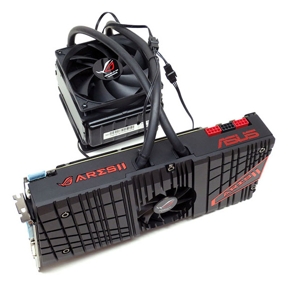 Этот год показал, что инженеры ASUSTeK Computer не испытывают недостатка в свежих идеях. В январе ASUS выпустила видеоускоритель ROG Ares II на двух чипах AMD Tahiti XT. От существовавших на тот момент моделей PowerColor Radeon HD 7990 он отличался более серьезным заводским разгоном (до 1050(1100)/6600 МГц), впечатляющим схемотехническим дизайном PCB и наличием предустановленной системы жидкостного охлаждения Asetek в составе двух водоблоков, радиатора толщиной 48 мм и двух 120-мм вентиляторов. Одна такая карта стоила полторы тысячи долларов.