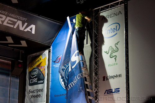 Перед началом турнира кипела работа: развешивались баннеры, готовились столы для бенч-стендов.