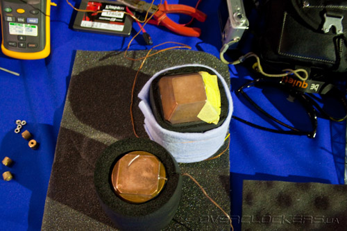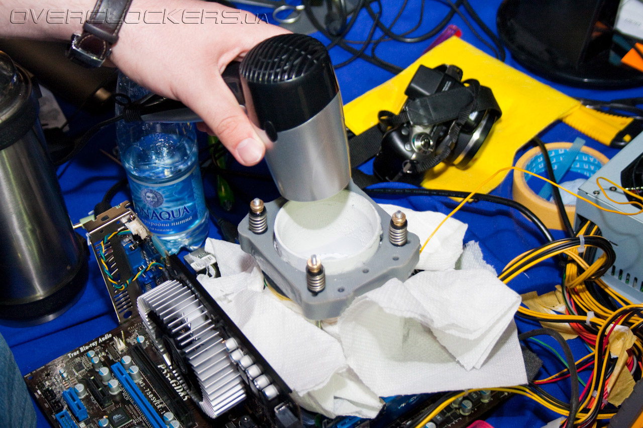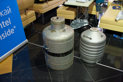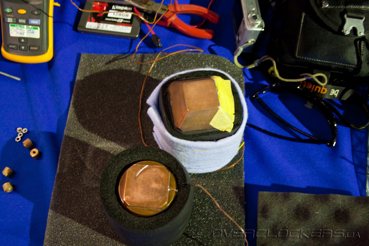 На мероприятии мы заметили четыре модели азотных стаканов: медный цельноточенный MAGNUM (TiN и T0lsty), MiniGUN — сборная медно-алюминиевая конструкция (Nick.ua и MaJ0r), легендарный Dragon F1 EE (mtech и Alex”H@Nter”Klein) и ещё один охладитель собственной разработки с зычным названием Warrior nitrogen (Highgertz и Yannn).
