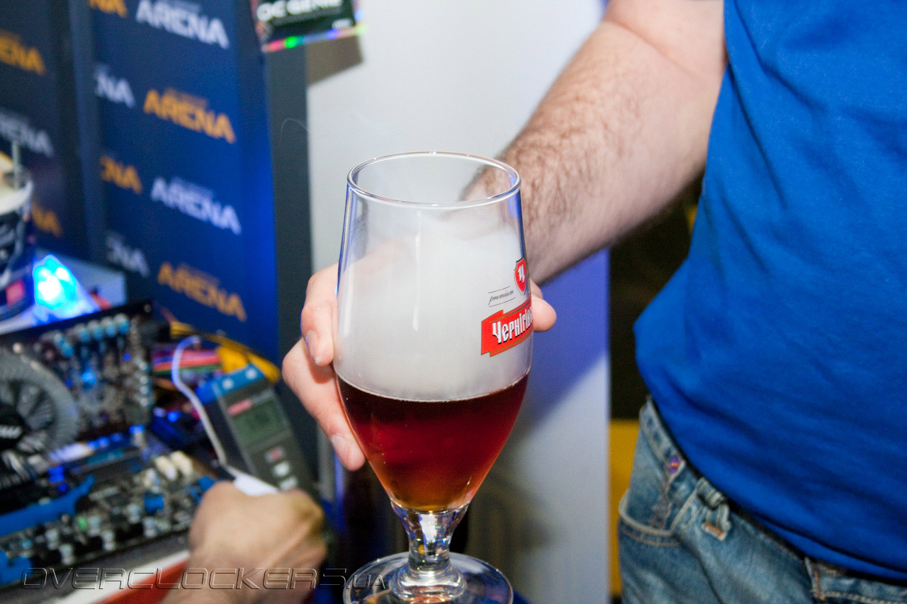 Подготовка участников к SuperPI 32M оказалась несколько затянутой (никто в 30 мин. подготовки не уложился) и паковка систем стаканами продолжалась даже во время финального отчета. Но и здесь не обошлось без курьеза. Примерно через 10 мин после старта, таймер исчез с судейского монитора, и его пришлось перезапускать. Таким образом, оверклокерам компенсировали (пусть и неумышленно) их нерасторопность.