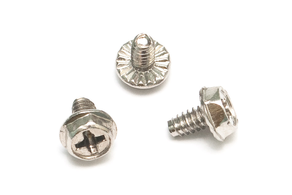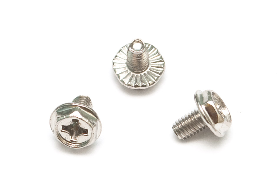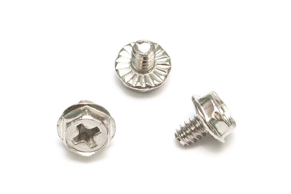 Дежурные болтики для крепления блоков питания. Насечка под головкой позволяет снять краску при закручивании и вдавиться прямо в метал для лучшего контакта, плюс не позволит самораскрутиться болтику. При тестировании железа лучше избегать — портят внешний вид. Шестигранная головка, видимо, позволяет использовать ключ, если крестообразной отвертки не оказалось под рукой. Никогда к такому не прибегал.