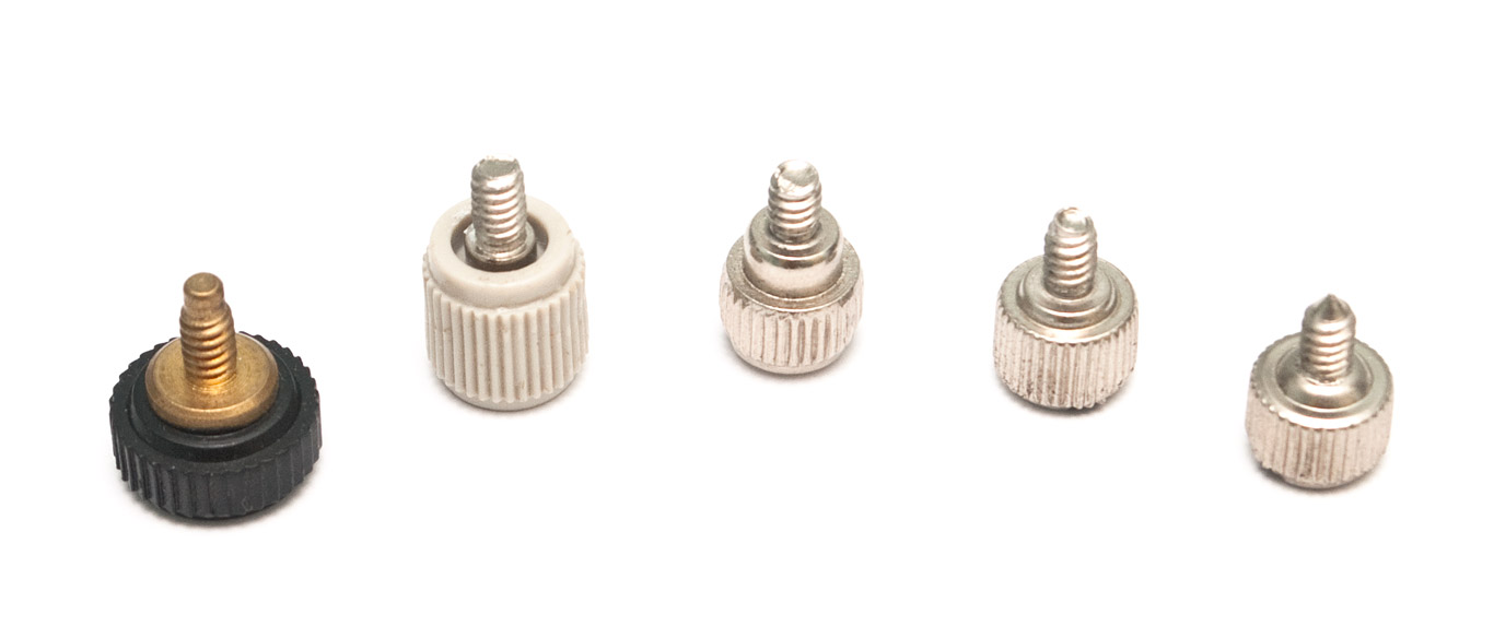 Итак, слева на право. Первый очень интересный по форме, головка выполнена из твердого пластика, при необходимости позволяет использовать шестигранный ключ. Но в работе не очень удобен. Второй является полным аналогом обычных винтов с накатанной головкой, есть даже крестообразный шлиц, с той лишь разницей, что имеет пластиковую обойму. Остальные три ничего особенного собой не представляют, лишь разнятся по высоте. В принципе, первый из них удобнее использовать.