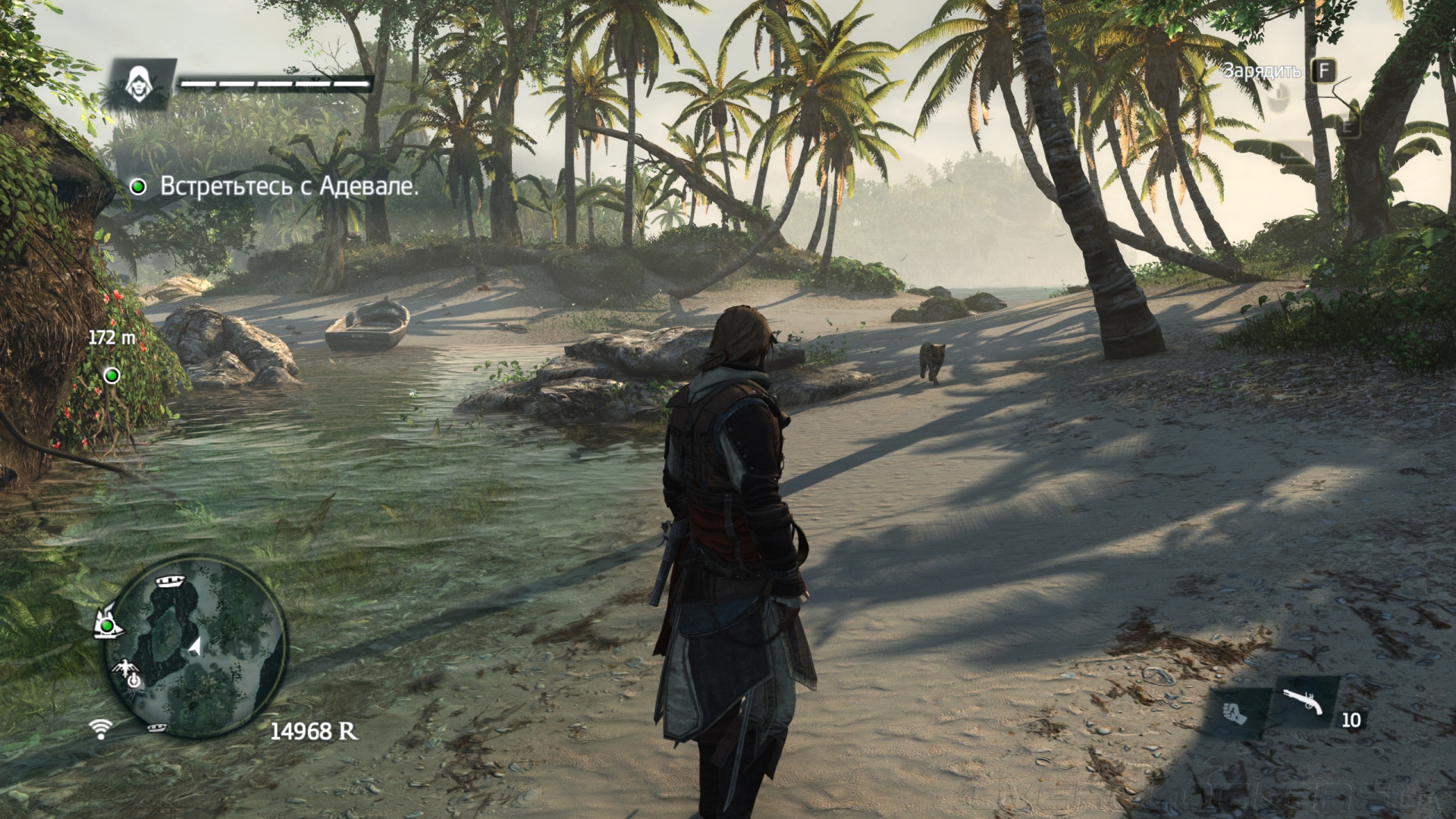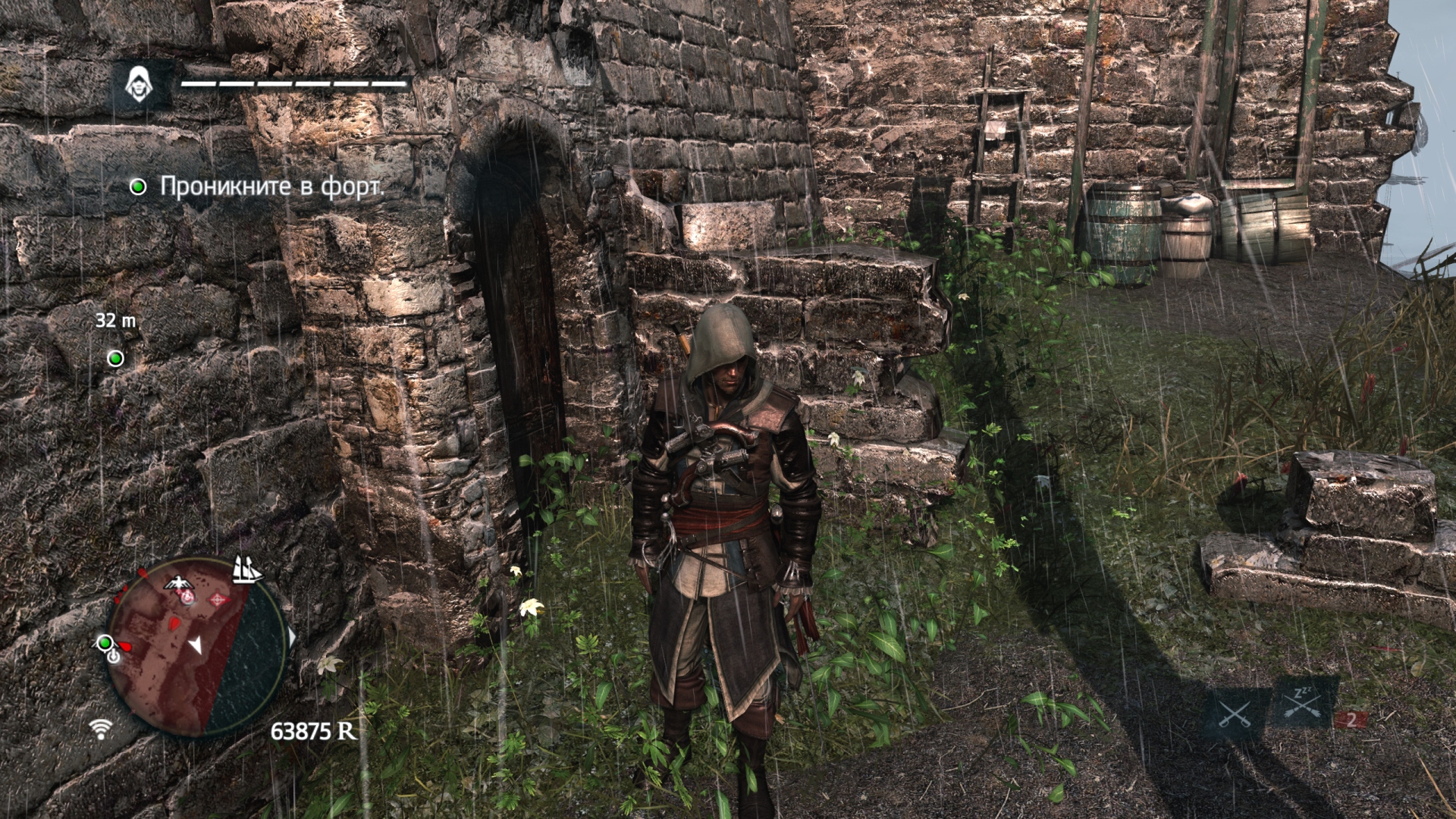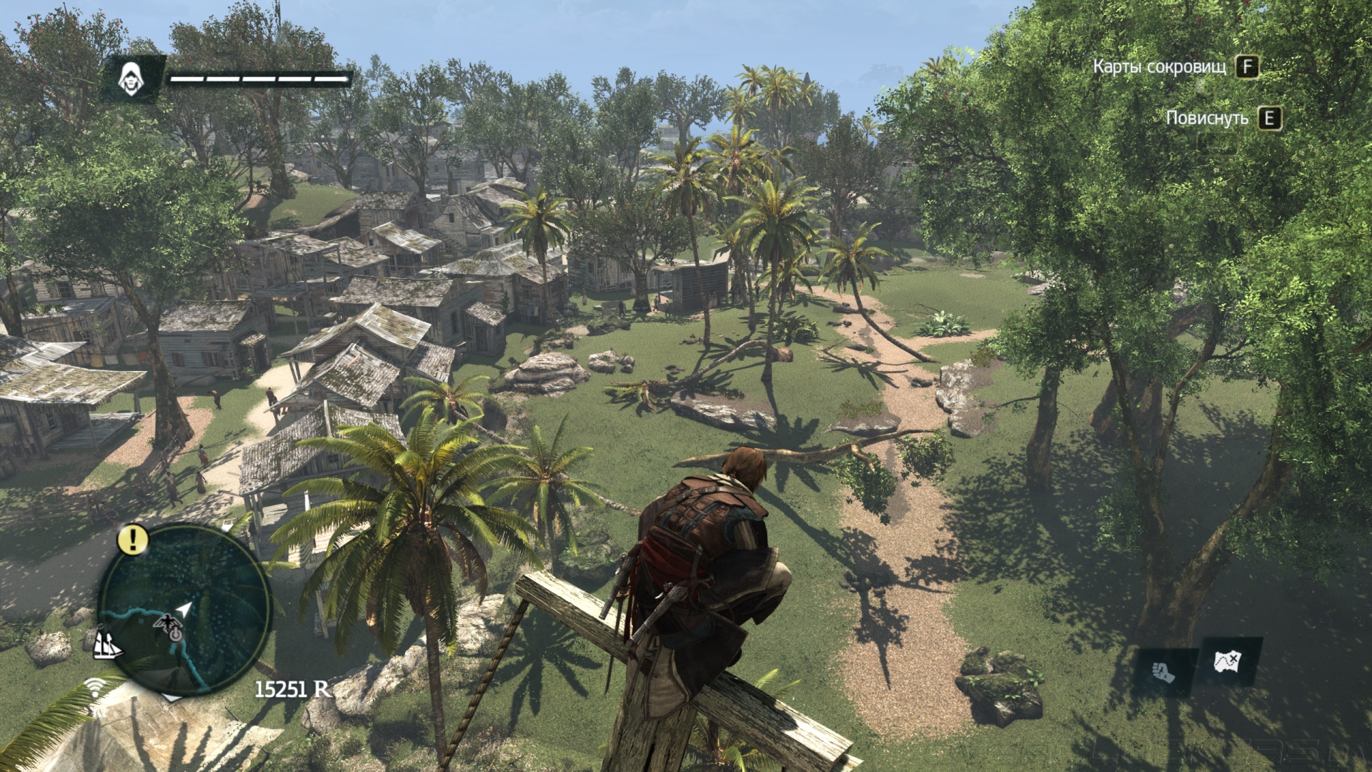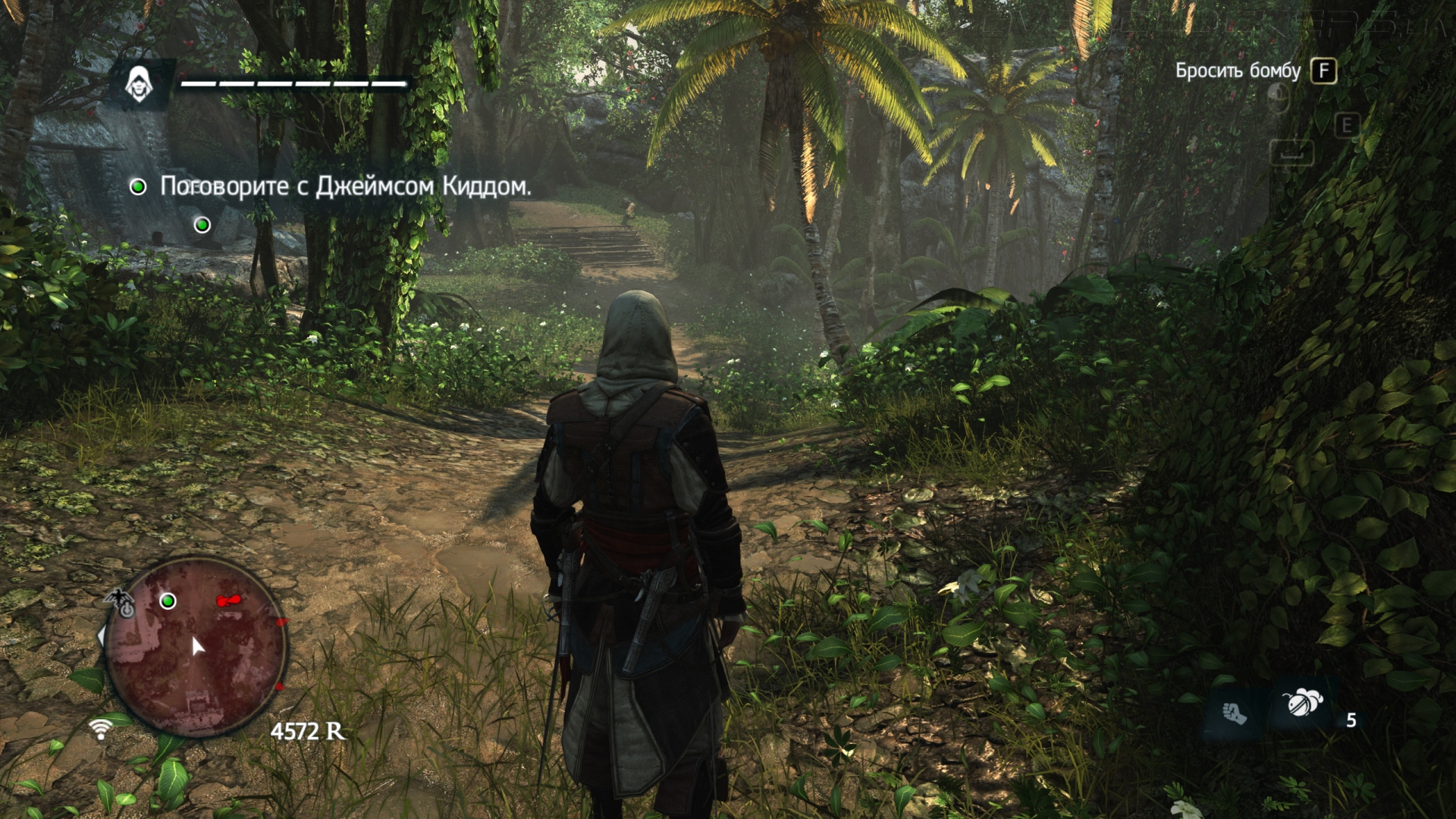 В целом, игровой процесс на суше остался почти без изменений. Мы взбираемся на обязательные вышки для синхронизации и открытия новых участков карты, собираем предметы и выполняем мелкие побочные задания. Среди новых задач — поиск кладов. Вначале мы находим какую-то карту, а потом по ней разыскиваем место, где закопан сундучок с золотишком. Вместо летающих рукописей теперь предлагают бегать за листками с пиратскими песнями для нашей корабельной команды. Есть ряд контрактных убийств для ассасинов. Они доступны с самого начала игры, хотя по сюжету в курс дела нас вводят лишь спустя несколько миссий.
