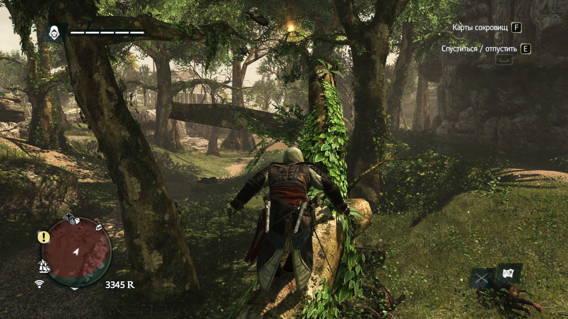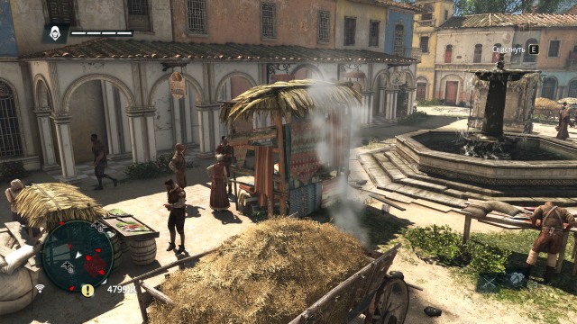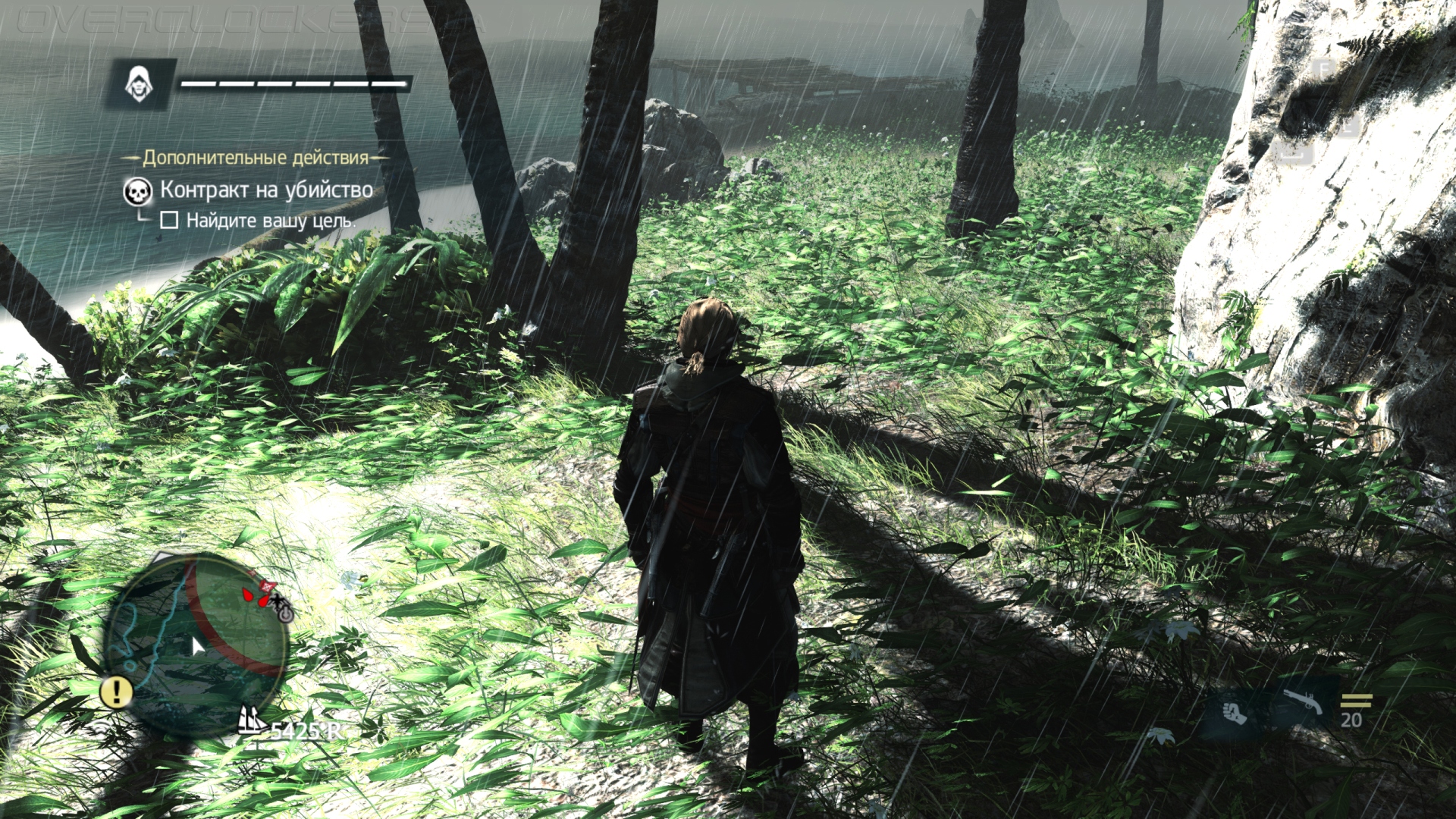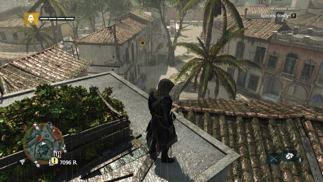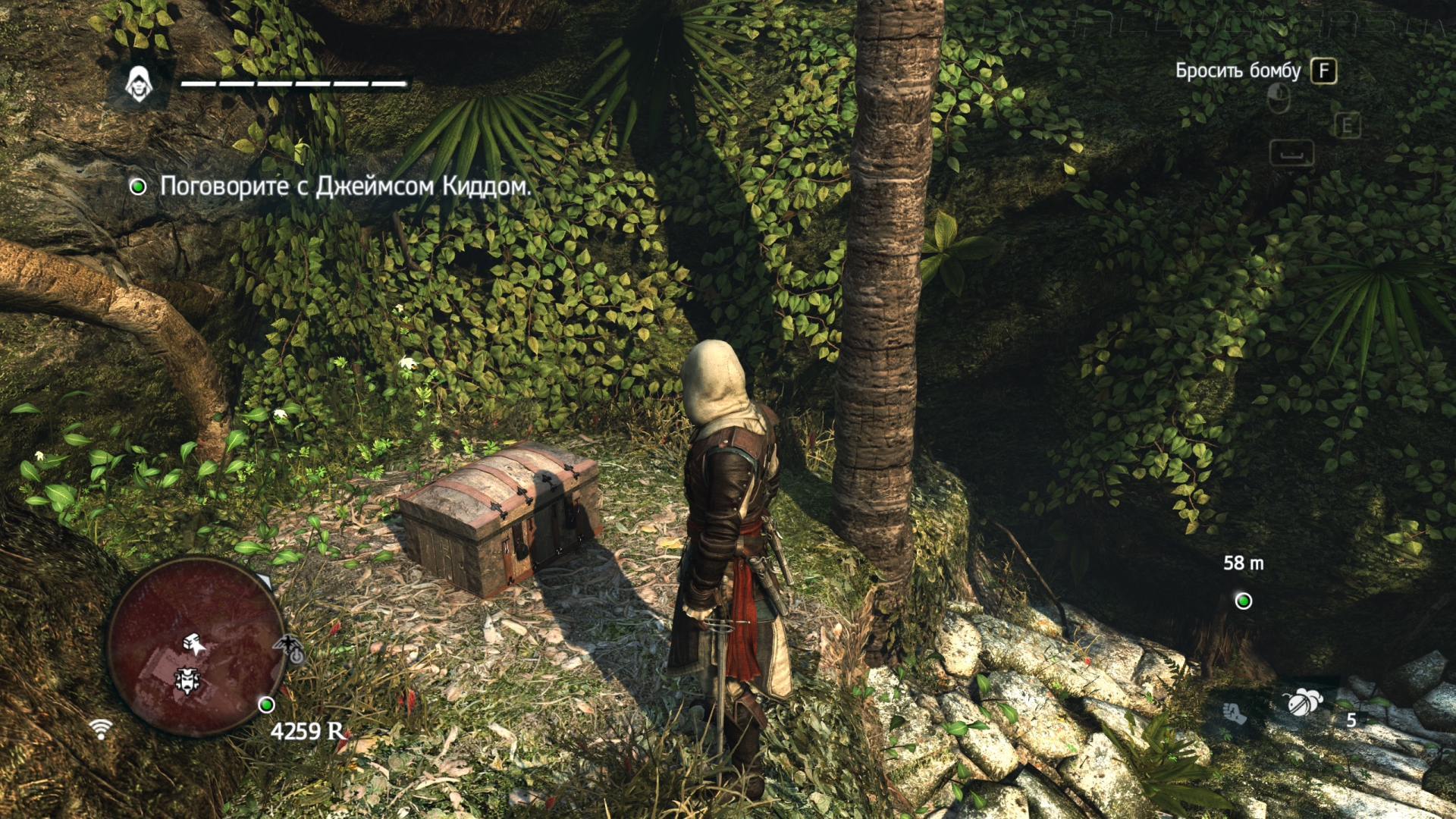 В целом, игровой процесс на суше остался почти без изменений. Мы взбираемся на обязательные вышки для синхронизации и открытия новых участков карты, собираем предметы и выполняем мелкие побочные задания. Среди новых задач — поиск кладов. Вначале мы находим какую-то карту, а потом по ней разыскиваем место, где закопан сундучок с золотишком. Вместо летающих рукописей теперь предлагают бегать за листками с пиратскими песнями для нашей корабельной команды. Есть ряд контрактных убийств для ассасинов. Они доступны с самого начала игры, хотя по сюжету в курс дела нас вводят лишь спустя несколько миссий.