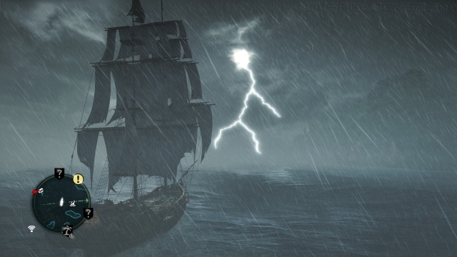 Управление кораблем осталось на прежнем уровне, появился только более скоростной режим при полных парусах. Направление ветра на управляемости и послушности судна сказывается минимально, но благодаря динамической системе изменения погоды теперь не избежать случайных встреч со штормами, где удерживать ровный курс будет очень тяжело. Black Flag не предлагает какого-то сверхреализма, все понятно и отзывчиво, что позволяет разыгрывать перед игроком масштабные сражения и ввязывать его в борьбу с дикой стихией. Солнечная спокойная погода может легко смениться мощной бурей с огромными волнами, норовящими перевернуть корабль. Появились даже смерчи, которые легко увлекают за собой судно, если не спущены паруса. Используя всего несколько кнопок, вы пытаетесь лавировать в бурном море, а перед вами разыгрывается настоящее зрелище — помощник выкрикивает команды, матросы снуют по кораблю, регулируя положение парусов, волны накатывают сверху и рассыпаются пеной, стекающей по палубе, плотная пелена дождя сверкает в отблесках молний.