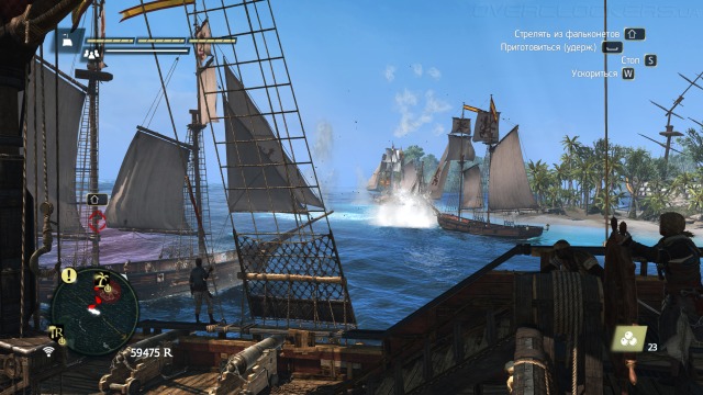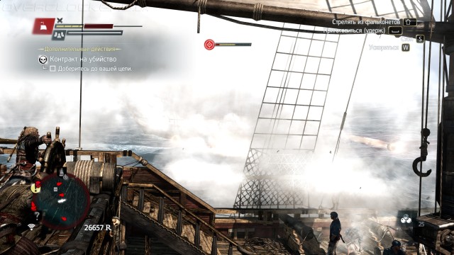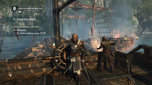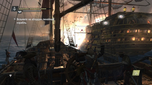 Вооружение судна стало немного разнообразнее со времен третьей части. Кроме бортовых пушек появились носовые орудия и мортиры, есть возможность сброса бочек с порохом позади себя. Тем не менее, успех боя все равно зависит от удачно проведенного залпа боковой артиллерии. Наконец-то стало возможным проводить абордаж в реальном времени, не прерывая бой. Когда сильно потрепанное ядрами судно подсвечивается специальной меткой, вы можете цеплять его крюками и подтягивать к себе. Матросы с обеих сторон активно участвуют в побоище. На дальних дистанциях противники отстреливаются и пытаются обрубить канаты. Если же корабль удалось подтянуть вплотную, то наша команда перебирается на его борт и вступает в рукопашную схватку. Сам герой может зрелищно сигать на чужую палубу с канатов или мачт, выполняя фирменные убийства в прыжке.