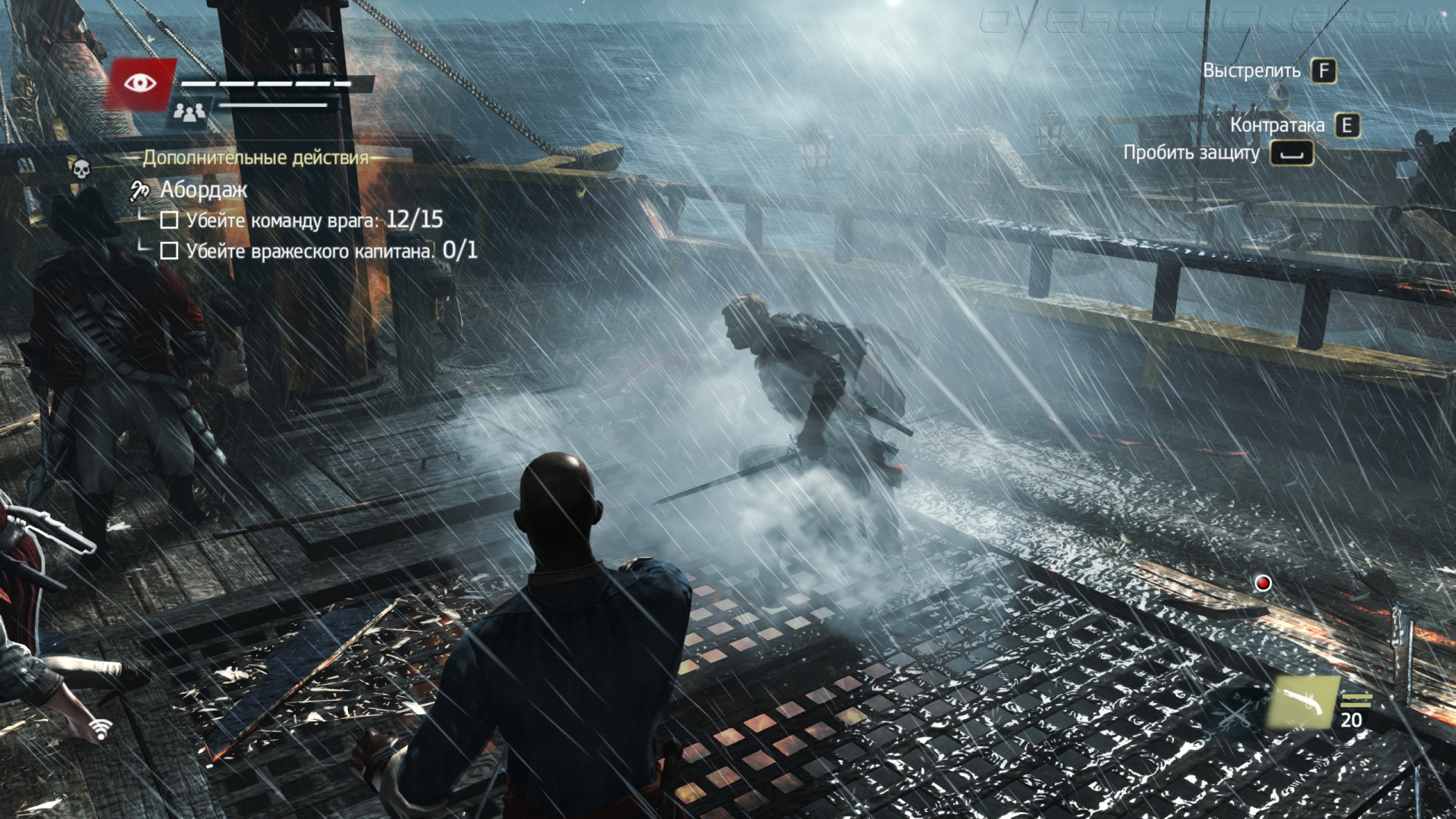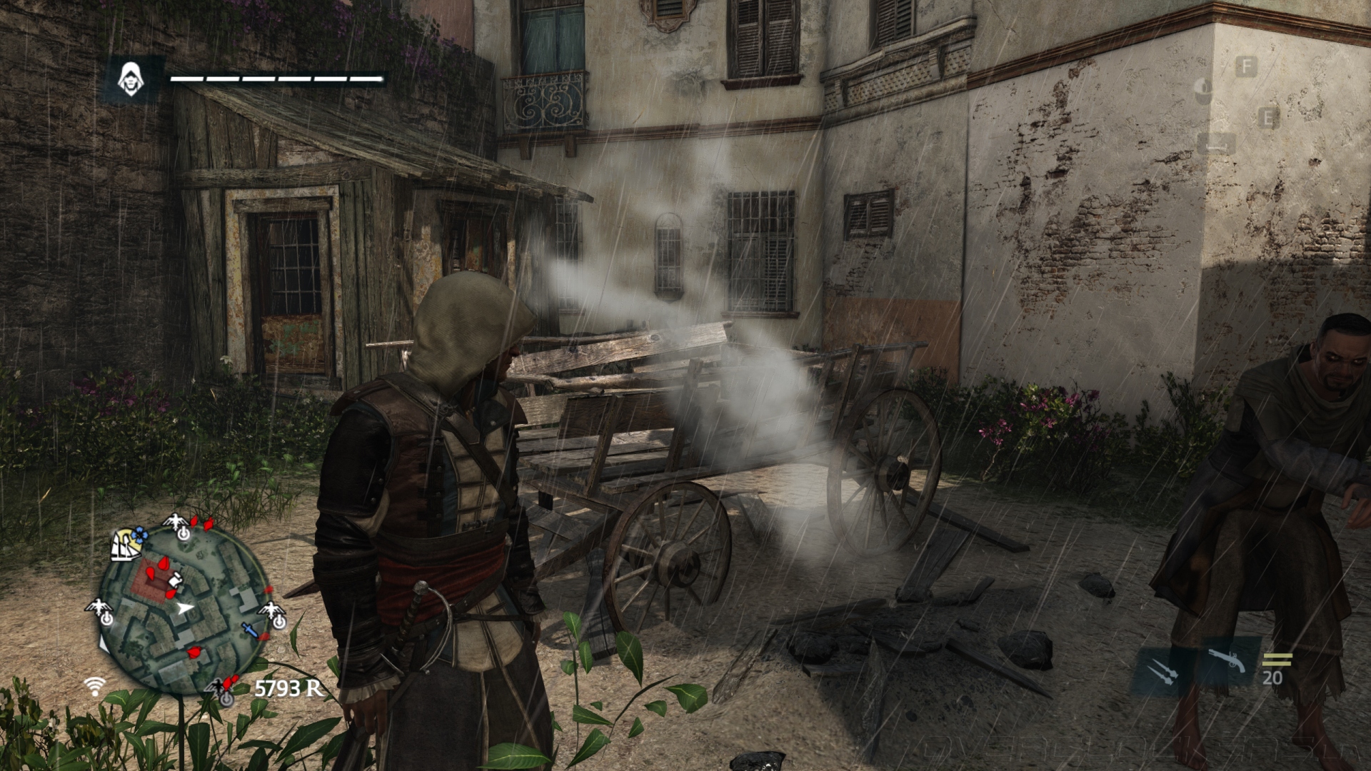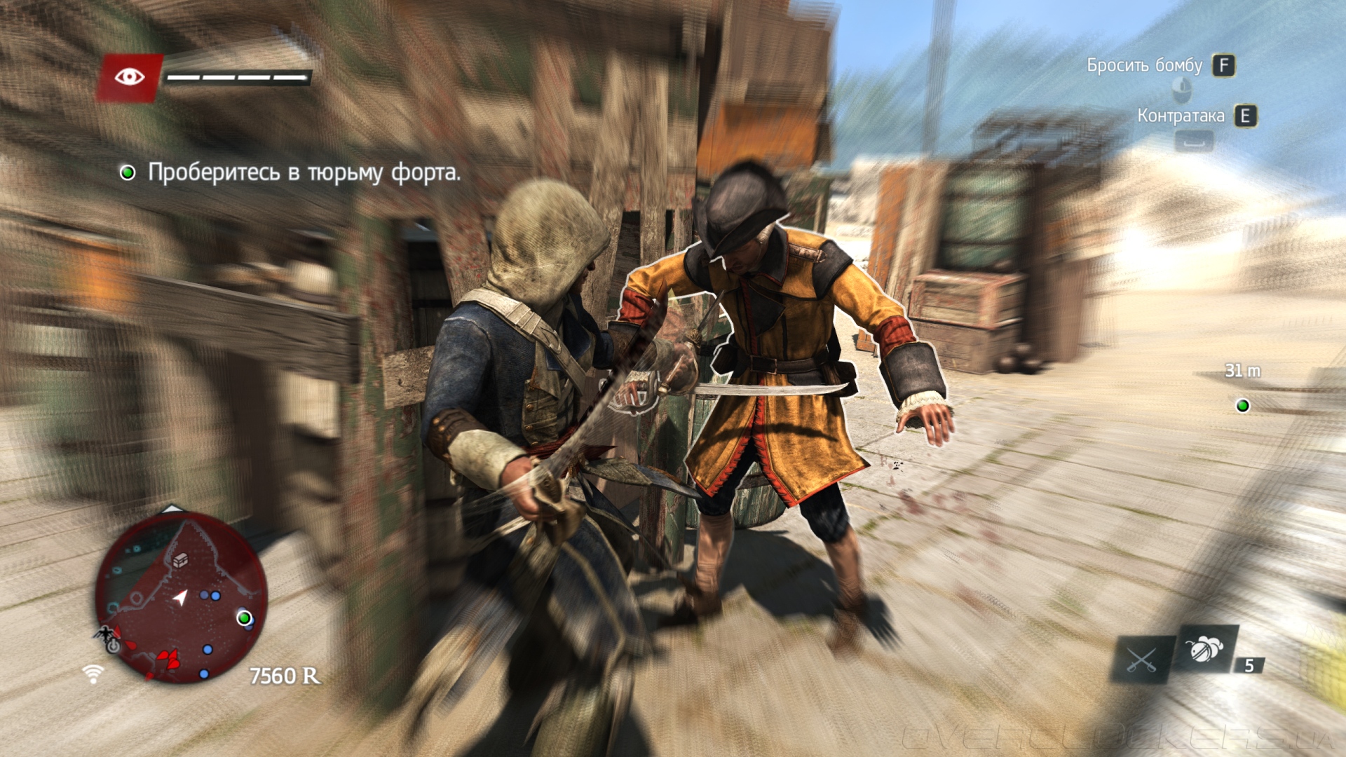 Набор оружия довольно широкий. Кроме пары шпаг и пистолетов нам доступны дымовые бомбы, различные дротики и даже экзотический шэнбяо. Стиль ведения боя у нового героя немного отличается от старых ассасинов, но никаких новых ощущений игра не дает. В чем-то схватки с холодным оружием даже стали проще, ведь теперь все держится исключительно на умелом парировании. В Assassin's Creed 3 с некоторыми противниками нужно было проявлять смекалку. А еще Коннор умел проводить эффектные комбо под сопровождение не менее эффектной плавающей камеры. В новой игре столь зрелищных комбинаций нет, лишь в моменты каких-то добивающих ударов идет замедление времени.