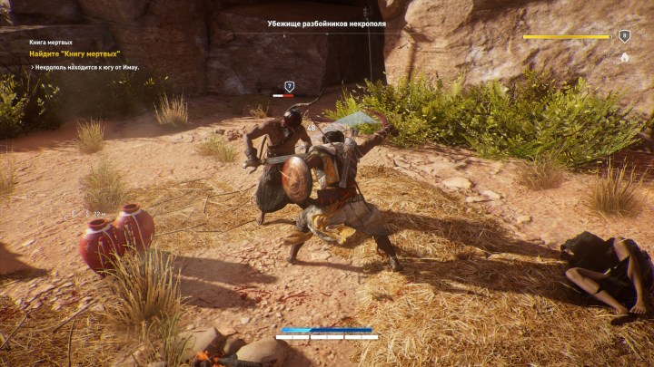Байек действует не столь изящно, как некоторые предыдущие герои. В бою он агрессивнее, и сами драки стали бодрее. Если раньше боевая система была завязана на контратаках, теперь больше приемов и нужно больше усилий для удачных атак. Используя блок, уклонение и разные удары, мы ловко фехтуем вокруг врагов и пытаемся пробить защиту мощных здоровяков. Серии ударов дают адреналин, что позволяет включить режим ярости с мощными ударами.