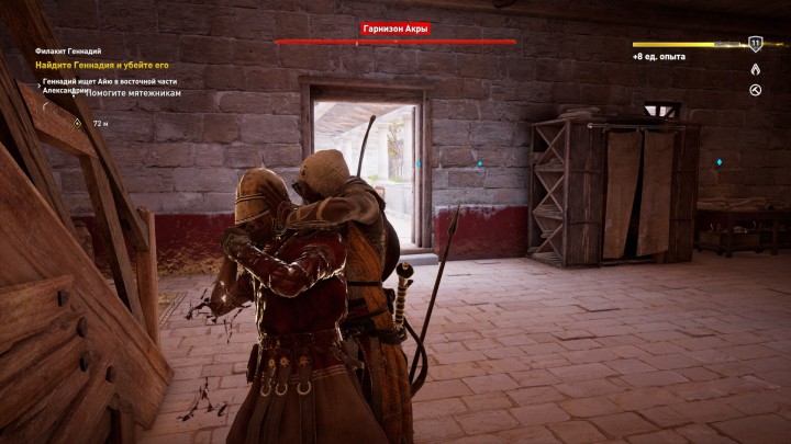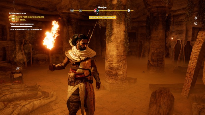 История развивается постепенно. Вначале есть бодрый старт, первое убийство на пути мести и постепенное знакомство с особенностями игрового мира по мере выполнения заданий в одном из селений. Далее герой воссоединяется с женой, которая оказывается приближенным лицом Клеопатры, и тут повествование выходит на более высокий уровень. Хвосты тайного Ордена тянуться в разные регионы Египта, за масками стоят крупные люди. Иногда эти убийства приводят к явным потрясениям. Где-то мы спасаем жителей от строящего козни злодея, но иногда негодяй проявляет неожиданную добродетель и выступает с иной стороны.