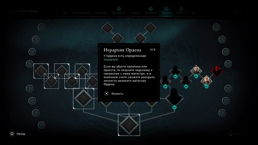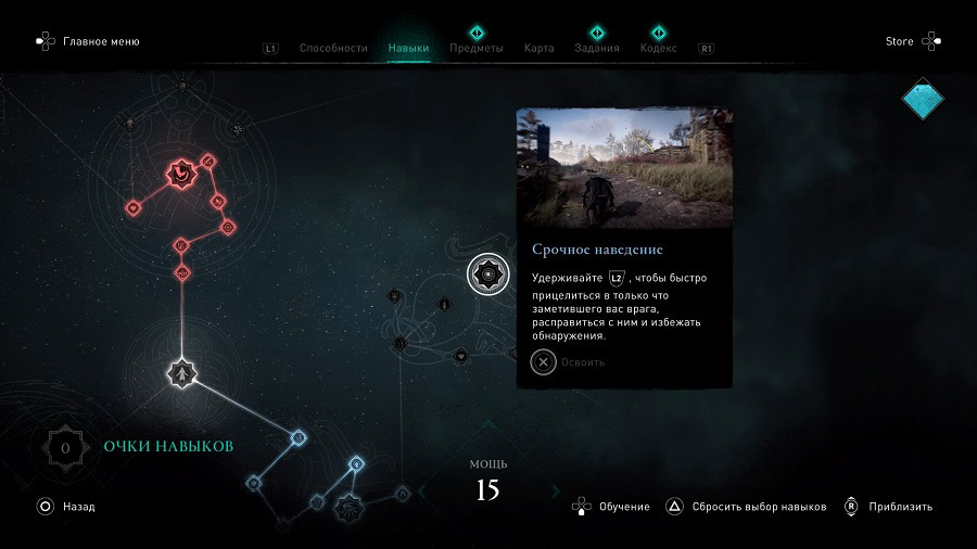 Их нужно вкладывать в огромное древо навыков. Часть из них базовые улучшения статов — плюс столько-то к слабой или сильной атаке, к урону в дальнем бою и прочее. Но в центре каждой «воронки» умений, а их здесь множество, находится уникальный перк, также прокачивающий атаки разным оружием или стелс. Помимо этого, есть и способности дальнего и ближнего боя. Их получаешь за книги знаний, которые можно найти при атаке на монастыри или на желтых точках карты.