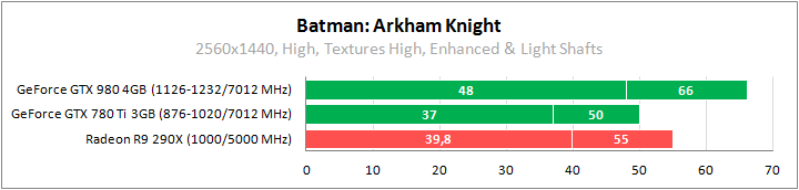 Соотношение сил у видеокарт Radeon R9 290X, GeForce GTX 780 Ti и GeForce GTX 980 привычное. Они легко справляются с максимальным качеством графики при разрешении 2560x1440. Лучшие показатели у GeForce GTX 980. Но при включении PhysX-эффектов могут появиться серьезные просадки в определенные игровые моменты.