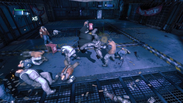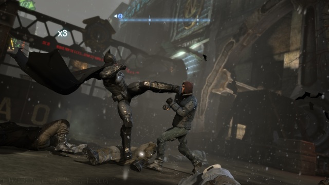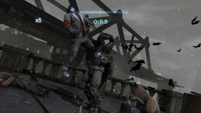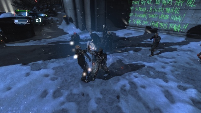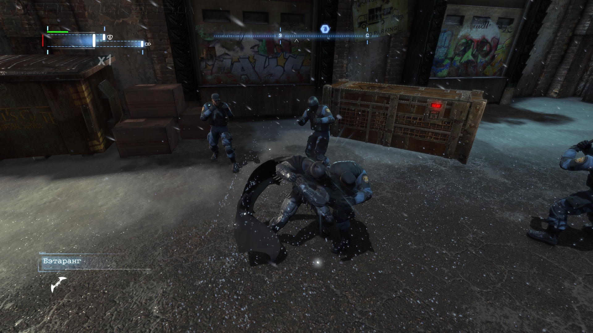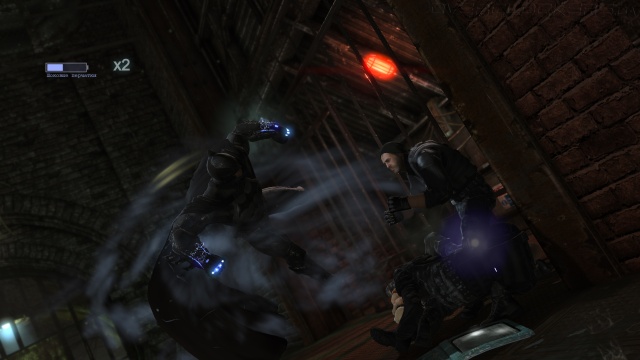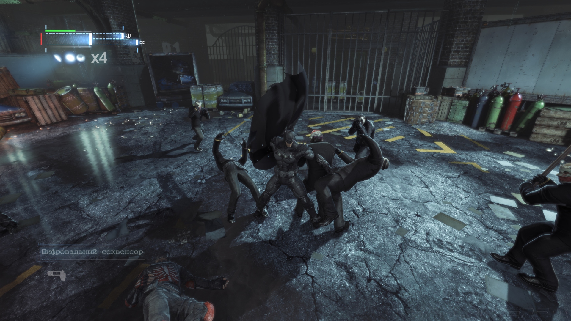 Игровой процесс не изменился. Основные наши занятия — драки и исследование мира. Никаких инноваций тут нет. Боевая система базируется на проведении непрерывных серий ударов и вовремя реализованных контратаках. В момент удара враги подсвечиваются специальными индикаторами. Если успеваете нажать соответствующую клавишу, то реализуете прием уклонения и ответного удара. При наличии всего двух кнопок (удар и контрудар) игра изображает очень зрелищные схватки. Бэтмен выполняет разные приемы и захваты в зависимости от того, какой удар врага он предотвратил. Подловили сразу двоих в момент атаки — провели уклонение и припечатали обоих лицом об асфальт. А если удается провести несколько обычных ударов без прерывания, то герой входит в кураж и начинается прыгать от одного противника к другу, нанося все более мощные и стремительные удары. Завершается эта боевая феерия финальным ударом в замедлении.