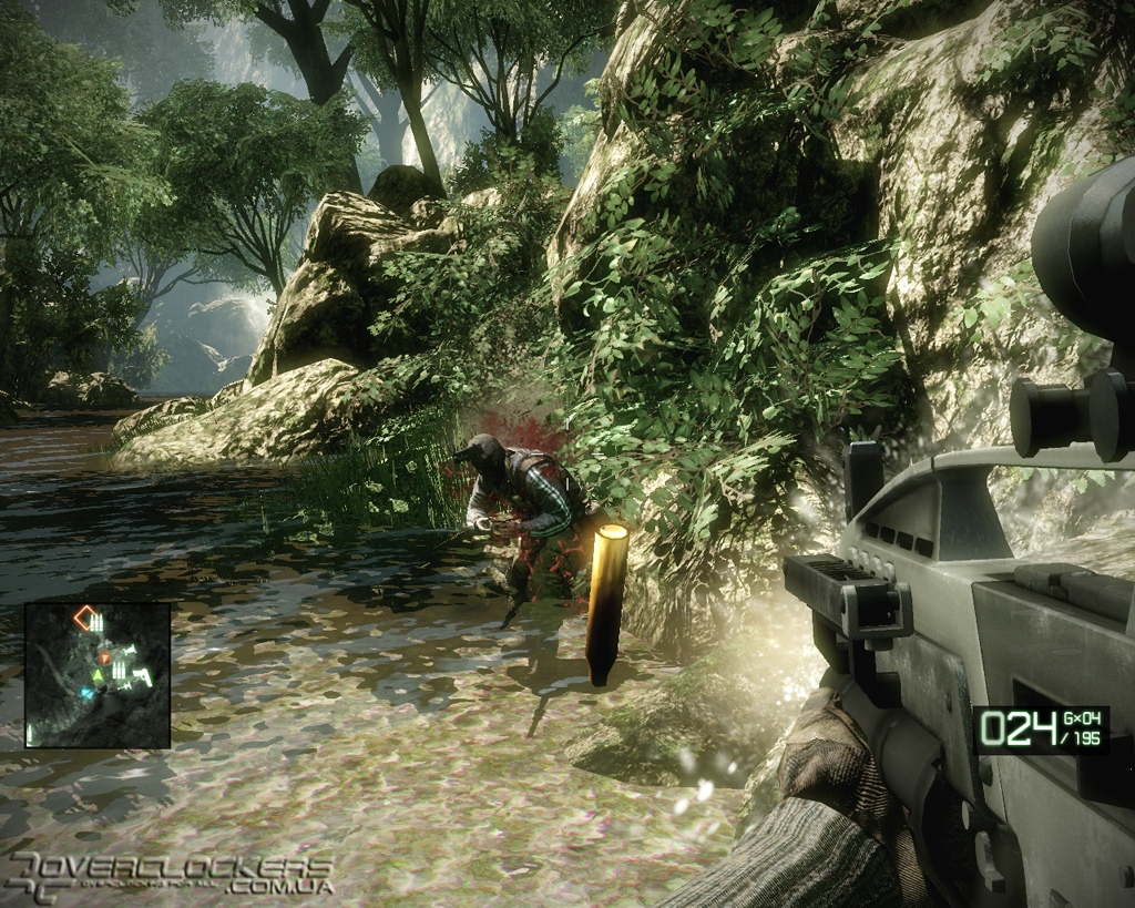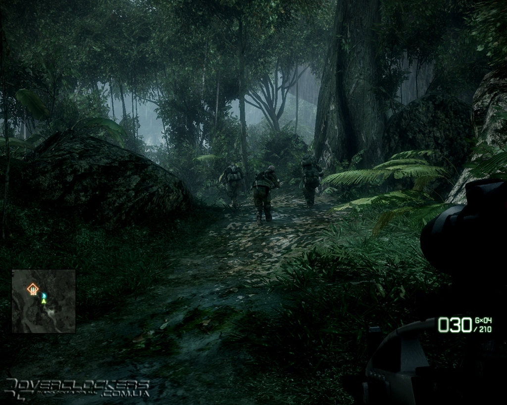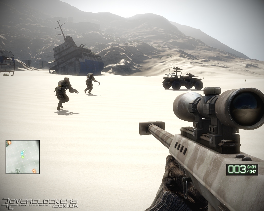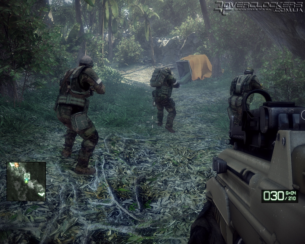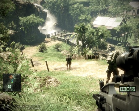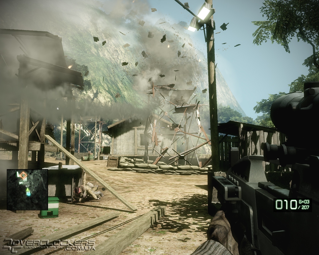 Оптимизируя движок под вычислительные возможности игровых приставок, разработчики постоянно играют с уровнем детализации удаленных объектов и часто прячут задние планы за всякими пост-эффектами, замыливания картинку. В Bad Company 2 эта ограниченность зоны видимости слишком явная. Дальние планы вечно погружены в белесую дымку тумана, а блестящий снег или песок сливаются в одно целое. Стоит вам оказаться напротив солнца, как эта искусственная близорукость и вовсе приобретает угрожающий характер. С учетом обилия пыли и дыма от взрывов и разрушаемых бетонных стен, видимость в таких ситуациях минимальная. С текстурами все точно так же – если вблизи земля представляет смесь опалой листвы и каких-то переплетающихся кореньев, а стволы деревьев опутаны лианами, то по мере удаления от наблюдателя все начинается превращаться в серую мазню.