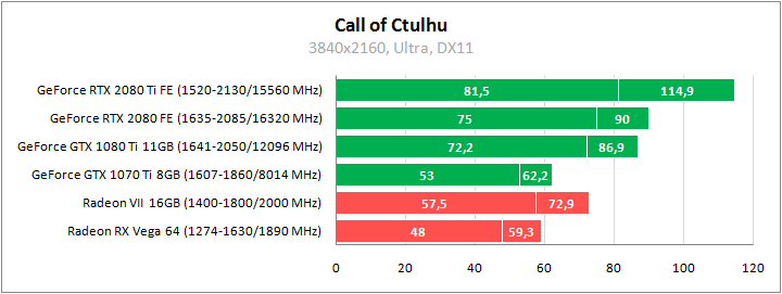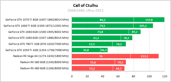 У GeForce есть явное преимущество над конкурентами. При этом комфортно играть в 1440p позволяет даже Radeon RX 480. GeForce GTX 1660 Ti сопоставим с Radeon RX Vega 64.